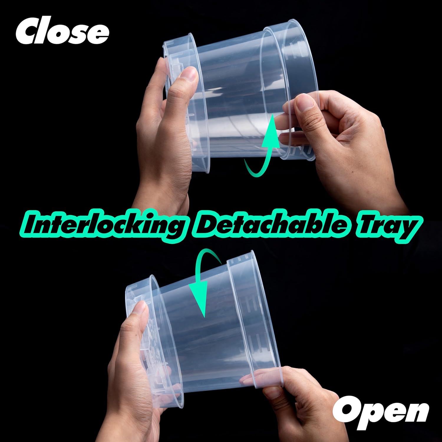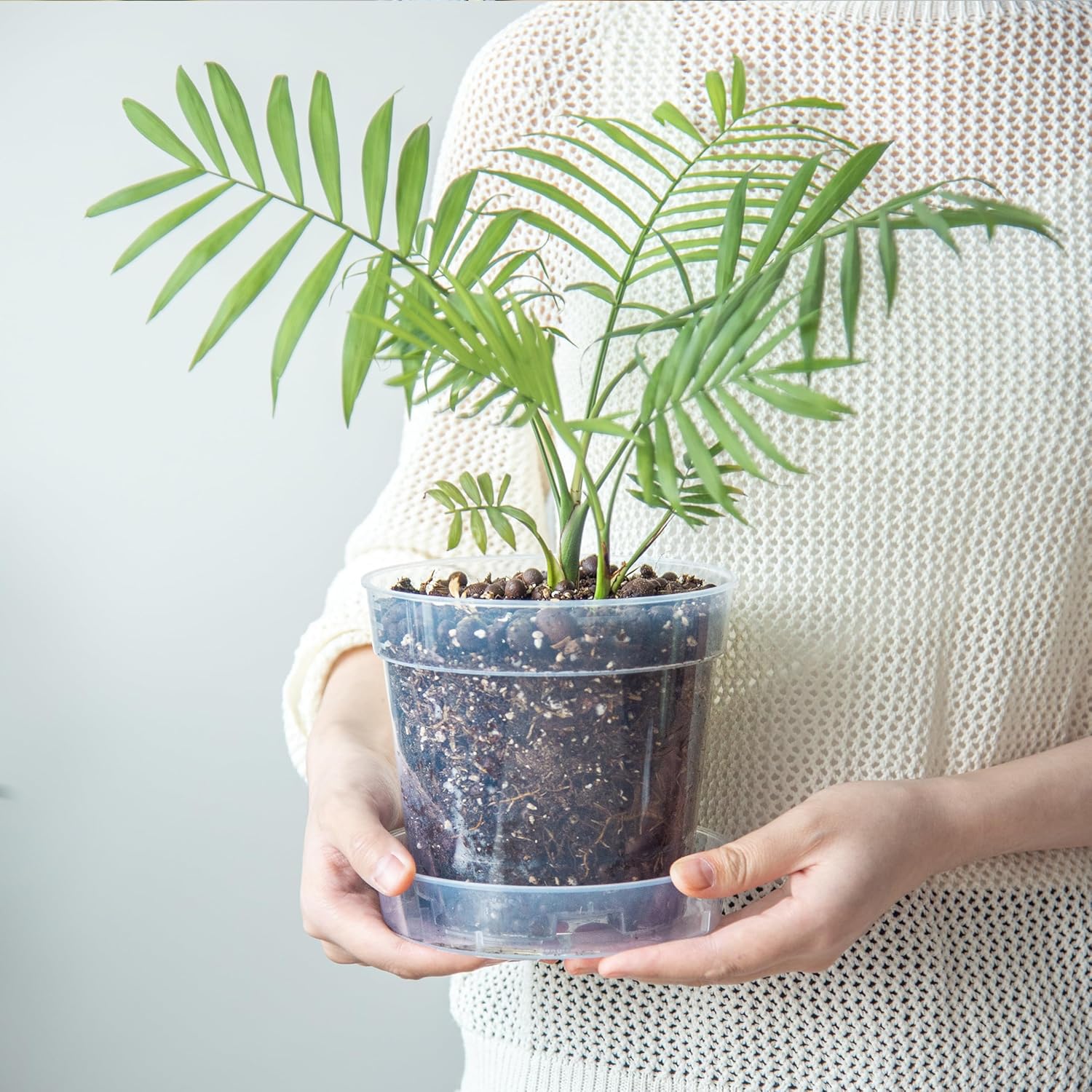 6 Inch Clear Plastic Plant Pot with Drainage Holes, Interlocking & Detachable Tray - Deep Saucer - Durable BPA-Free Plastic, Transparent Design, Raised Base for Airflow, Set of 12, 92-X-B-5