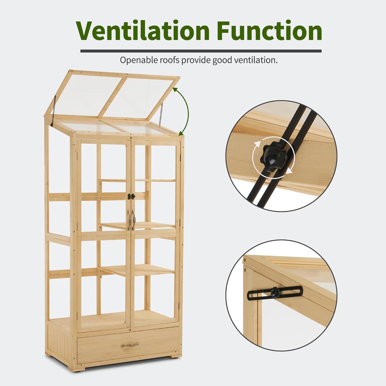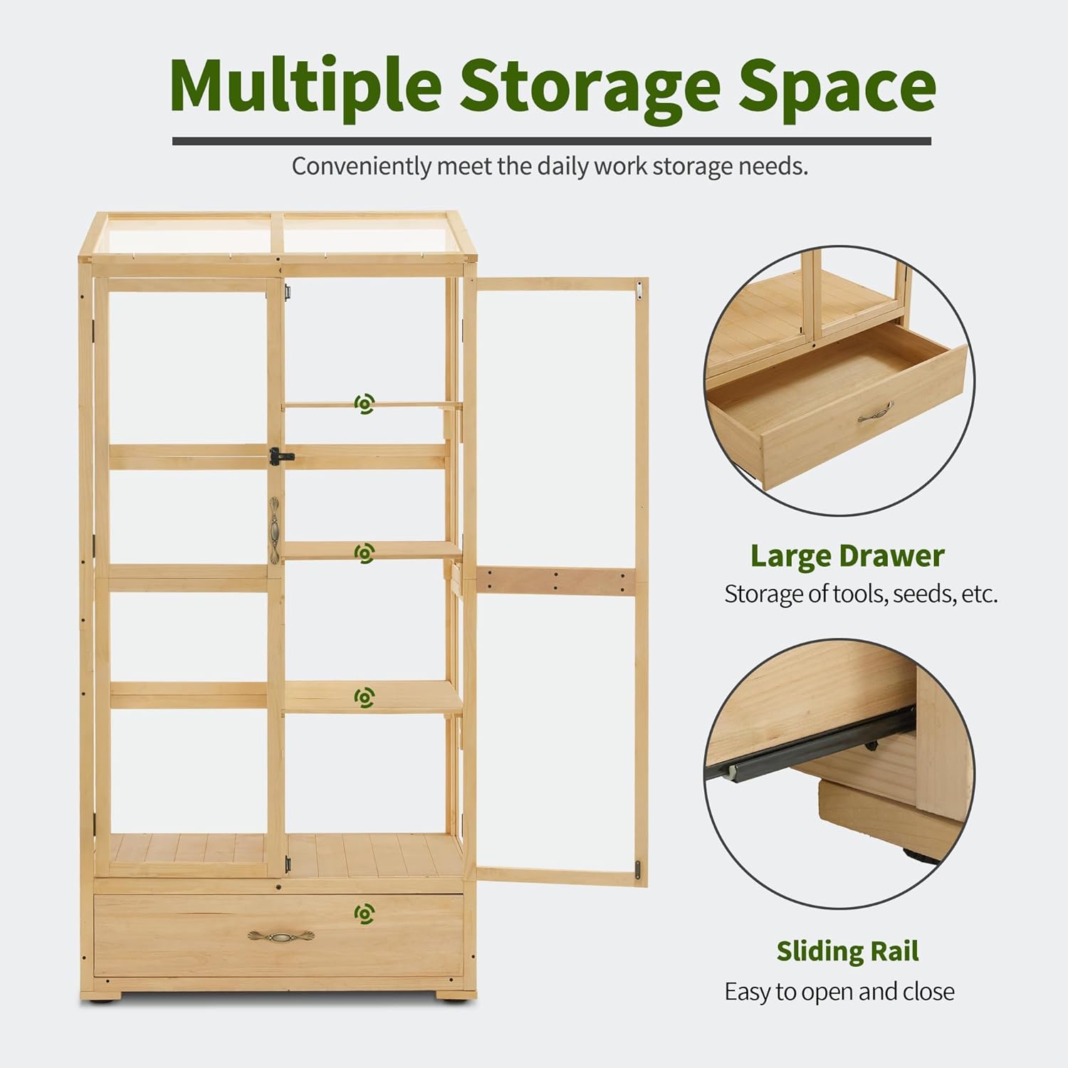- One Push-pull Drawer: The wooden greenhouse includes a push-pull drawer, equipped with a high-quality sliding rail that ensures smooth pushing and pulling when used; You could store flowerpots, seeds, tools, etc. in it to keep the environment tidy