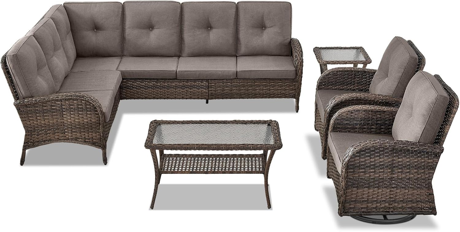 - Complete Patio Furniture Set Details: Transform your patio into a stylish haven with this 6-piece outdoor patio furniture set. This patio conversation set offers versatility and elegance for gatherings or quiet relaxation, featuring an L-shaped outdoor sectional sofa, an outdoor swivel glider chair, a sleek wicker coffee table, and a matching side table.