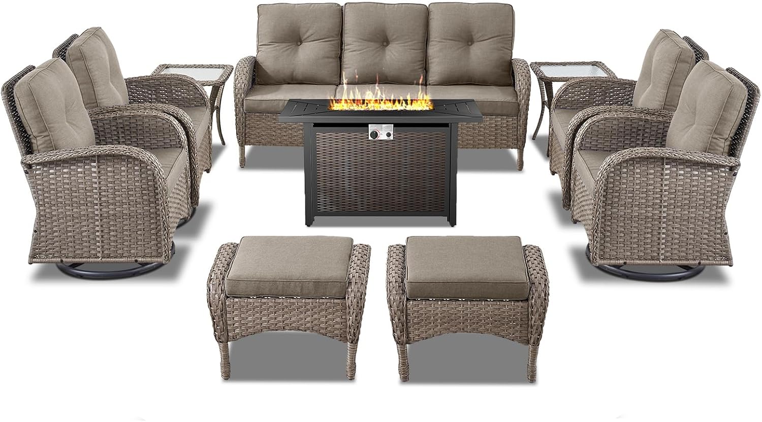 - Complete Patio Furniture Set Details:Transform your backyard into a luxurious retreat with Belord 10-piece outdoor patio furniture set with fire pit table. Featuring a spacious 3 seater sofa, four swivel rocker chairs, two versatile ottomans, two side tables, and a 43-inch fire pit table, this patio furniture set is perfect for hosting unforgettable outdoor gatherings or relaxing evenings.