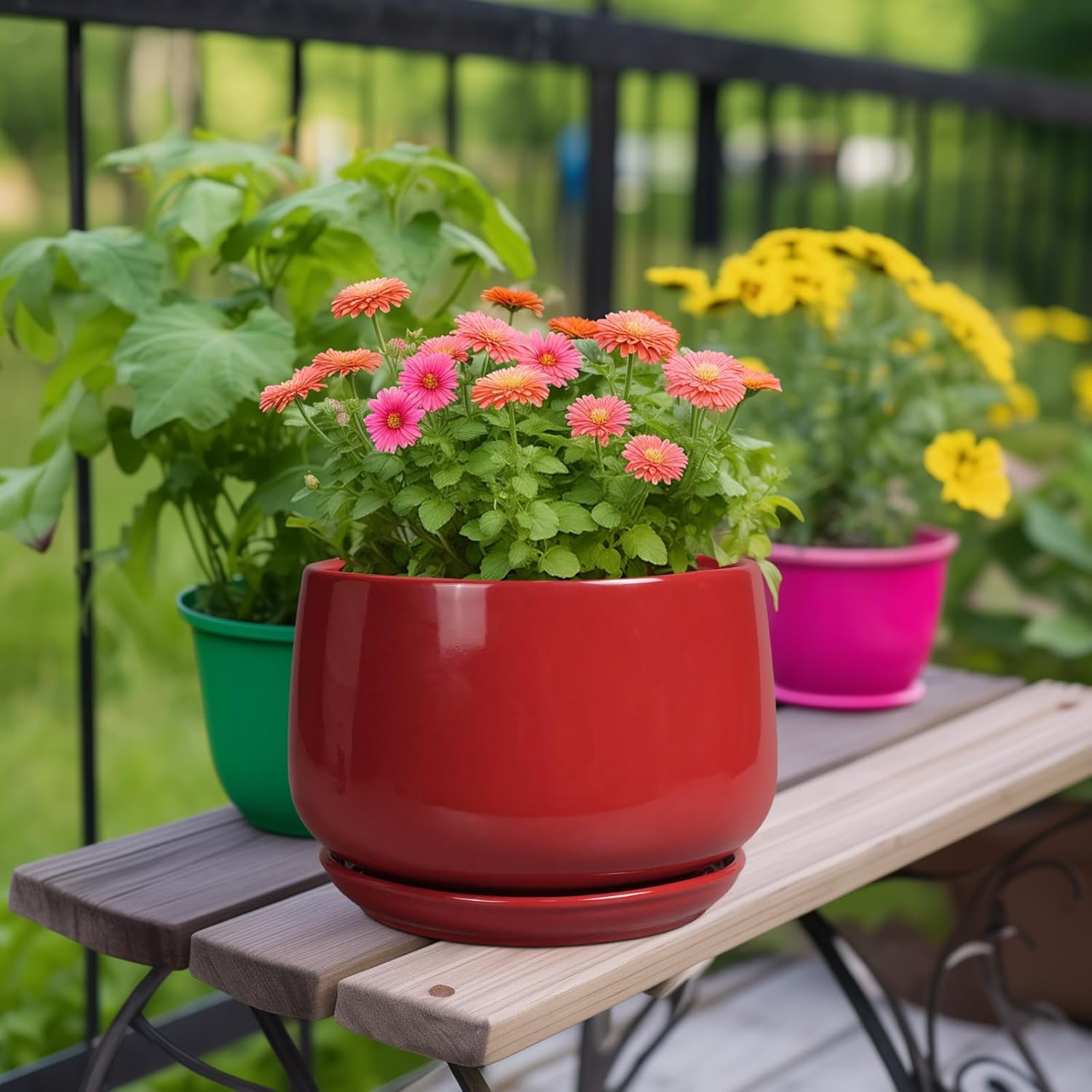 G EPGardening Ceramic Plant Pots - 9 Inch Flower pots for Indoor Outdoor Plant, Round Planter with Drainage and Saucer, Modern Home Decor, Gift for Women Men, Red