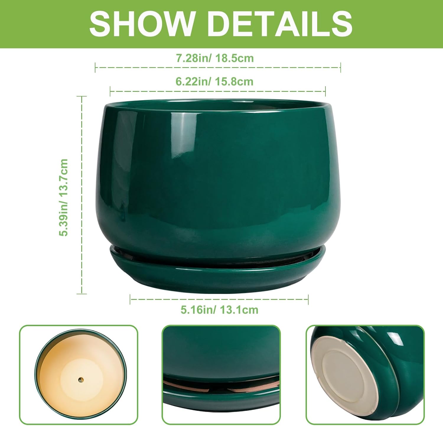 G EPGardening Ceramic Planter for Indoor Plants - 7 Inch Plant Pot, Round Planter with Drainage and Saucer, Round Flower Pots for Outdoor, Modern Desk Decor, Gift for Women Men, Green