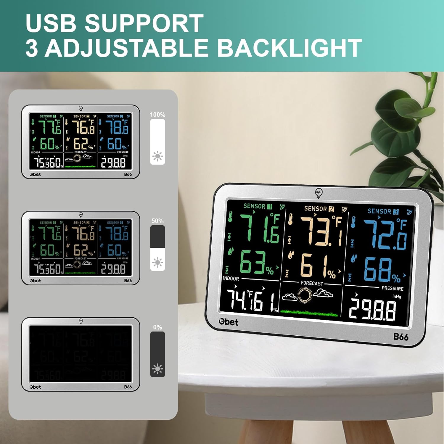 - USB Support 3 Adjustable Brightness: Home weather station is designed to be easy to read in any lighting condition with 3 adjustable backlight settings: high, low, and off. When connected via USB, the backlight stays on continuously for clear visibility, while on battery power, it automatically turns off after 10 seconds to save energy.(The package does not include a USB plug)