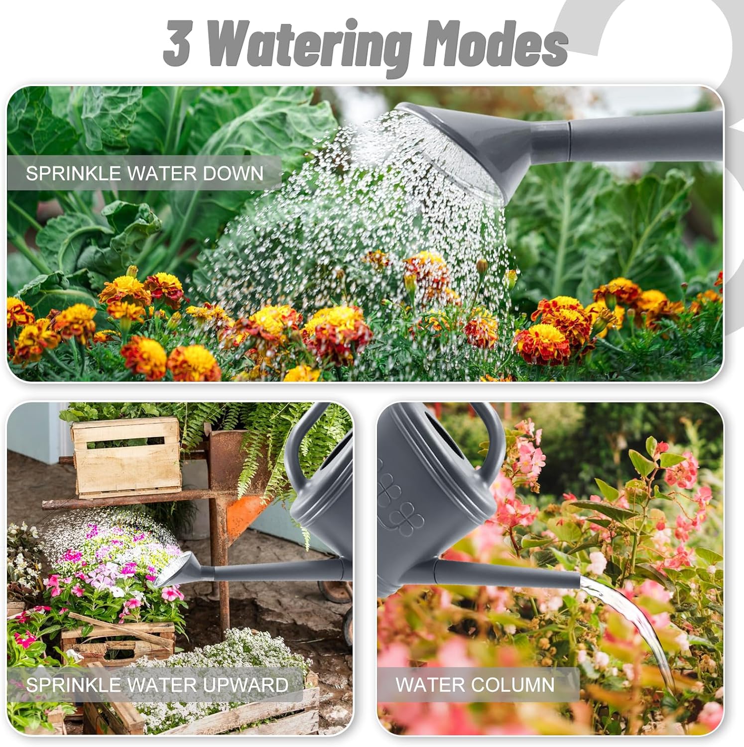 - Choose Freely, Switch Freely: Outdoor watering can with removable stainless steel shower head, can freely switch different watering modes, the shower head can evenly sprinkle water to protect delicate plants, and take off the shower head can be switched to the water column mode to water more water consumption of plants, which can meet the needs of different plants