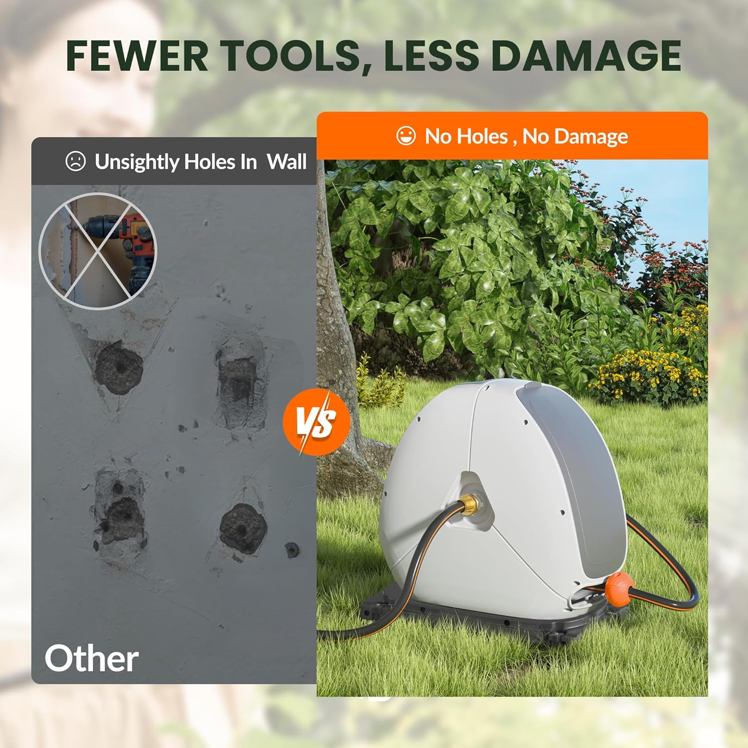 - LESS TOOLS, LESS FUSS – No wall damage or complicated installations needed! Easily install our reel on lawn using only a hammer (concrete installation option also available), while compact and sleek design complement any outdoor décor.
