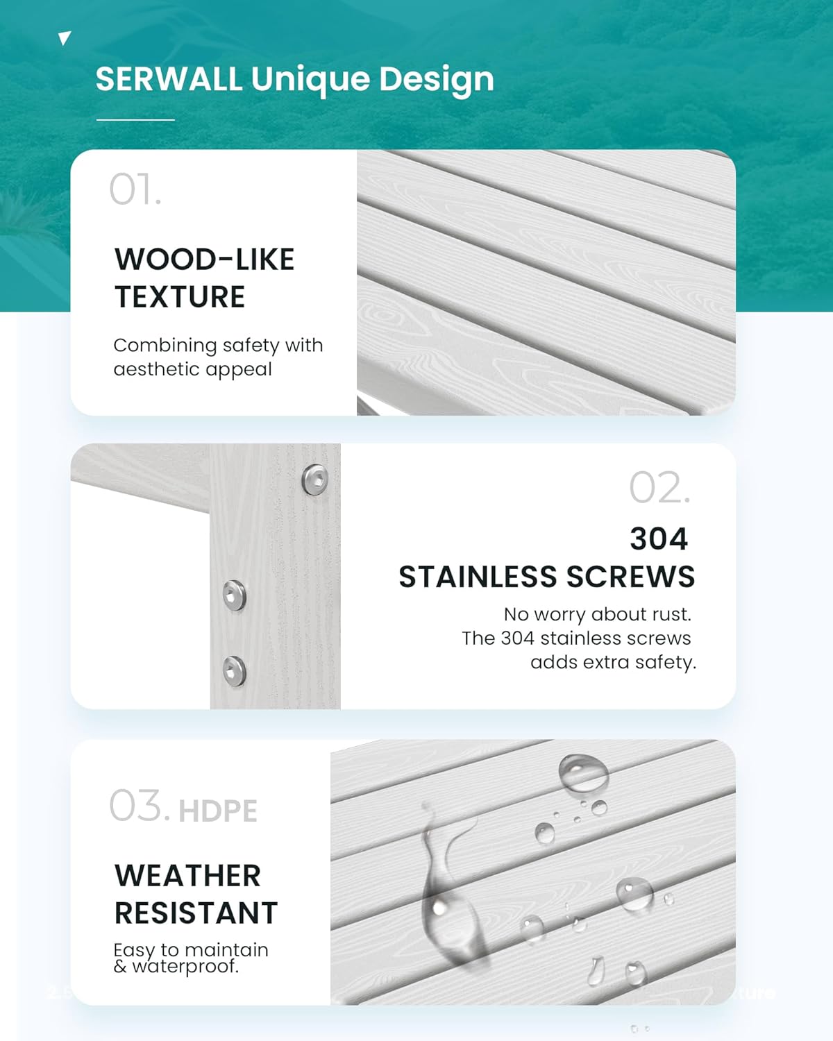 - Waterproof & Fast-drying β The slatted HDPE material is designed to shelter from rain and dry quickly, so you don't have to wait long after a storm to use it. Ideal outdoor furniture for poolside.
