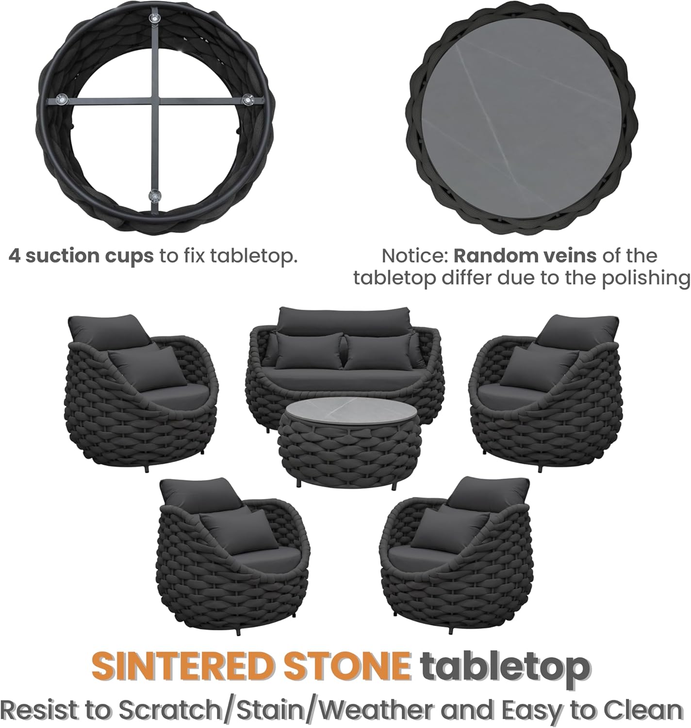 - Easy cleaning and scratch-resistant sintered stone tabletop is fixed by 4 suction cups. Cushions cover replaceable removal and machine washable. Adjustable nylon feet levelers for uneven floor also prevent scratching