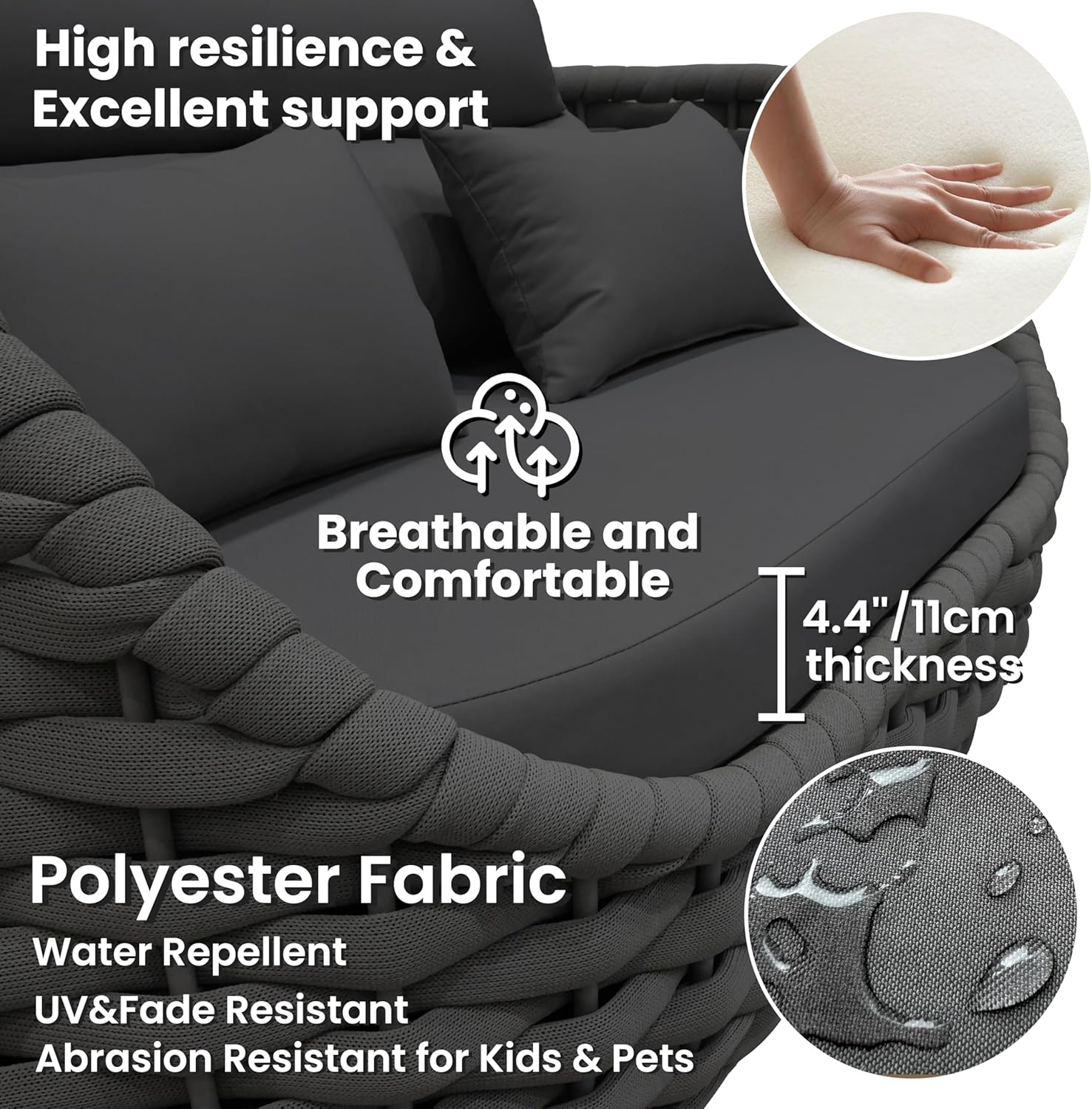 - Filled with 4.3"/11cm thick high-density sponge and cotton, cushions are soft touching and breathable for a refresh comfy patio seating holding its shape in long time using. Water repellent and abrasion resistant polyester fabric also fits families with kids and pets