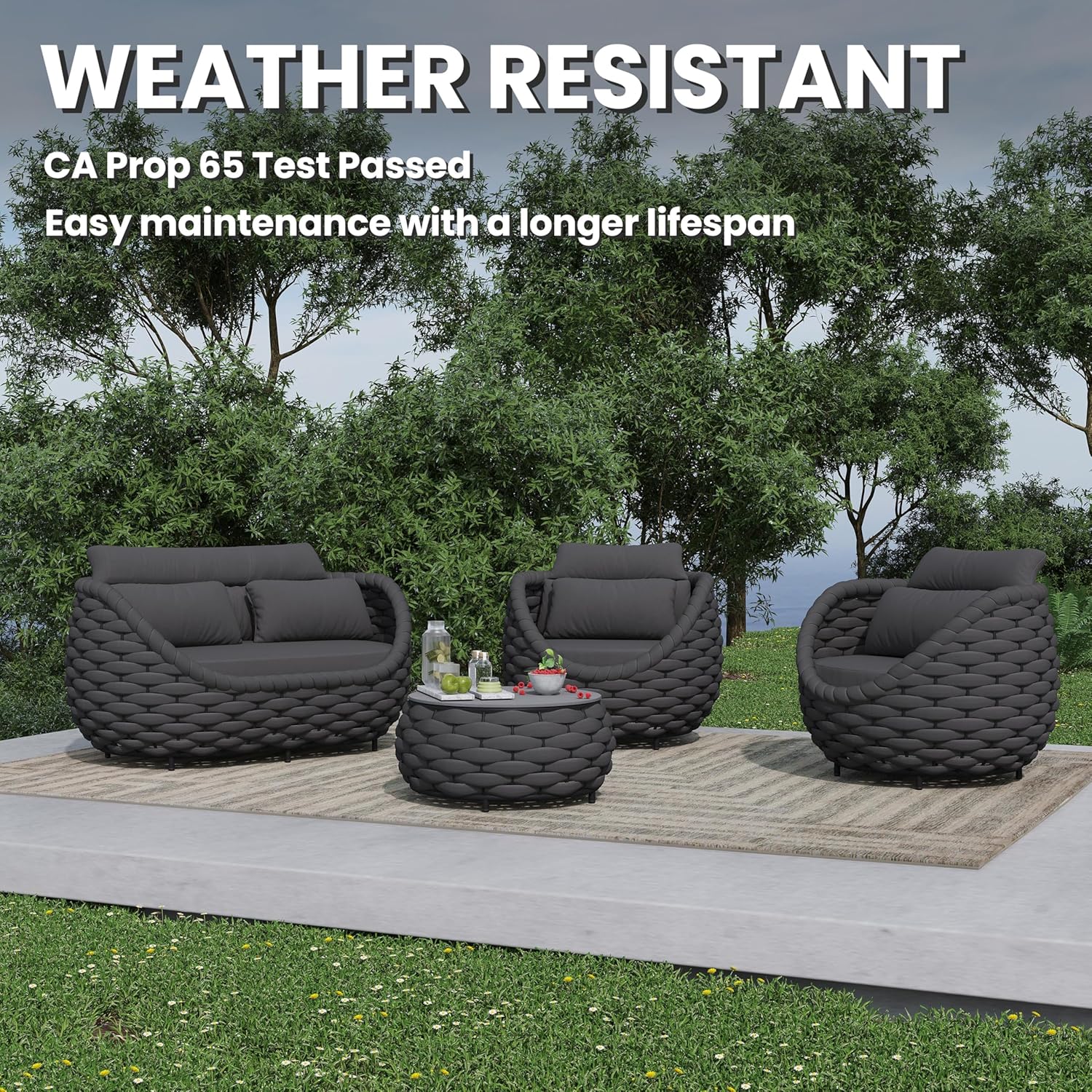 - Furniture set is crafted from reinforced rust-free aluminum alloy frame, wrapped in hand woven textilene rope. The 6 pieces all weather patio upholstered conversation set resists to UV, rain, wind, salt water. Perfect for indoor outdoor even arid or coastal areas