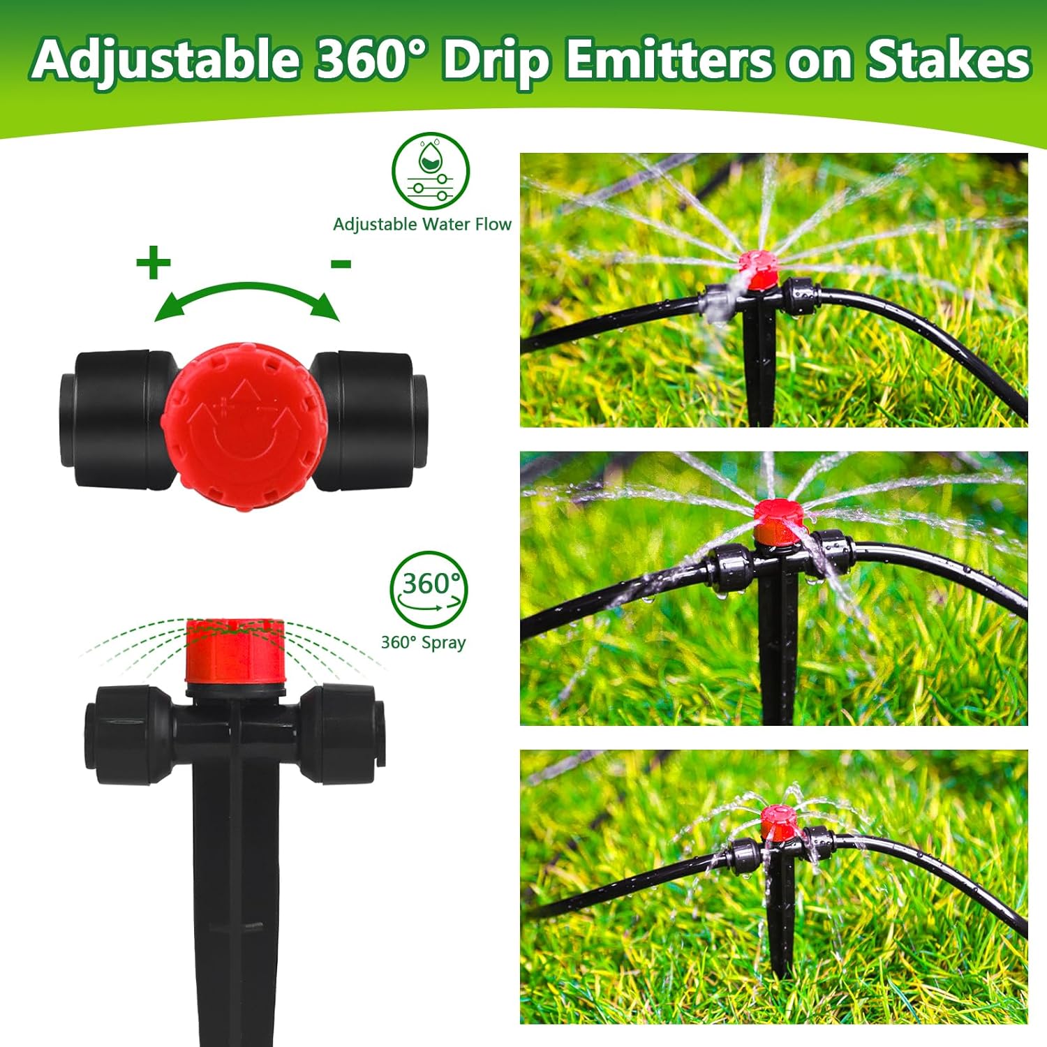 - Adjustable Water Flow: Gain total control over your irrigation with our adjustable flow 1/4" drip 360 sprayer. Easily switch from fine droplets to a steady stream, adjusting the spray diameter up to 10 feet to meet the specific needs of every plant in your garden. And when watering isn’t needed, you can effortlessly turn them off to conserve water