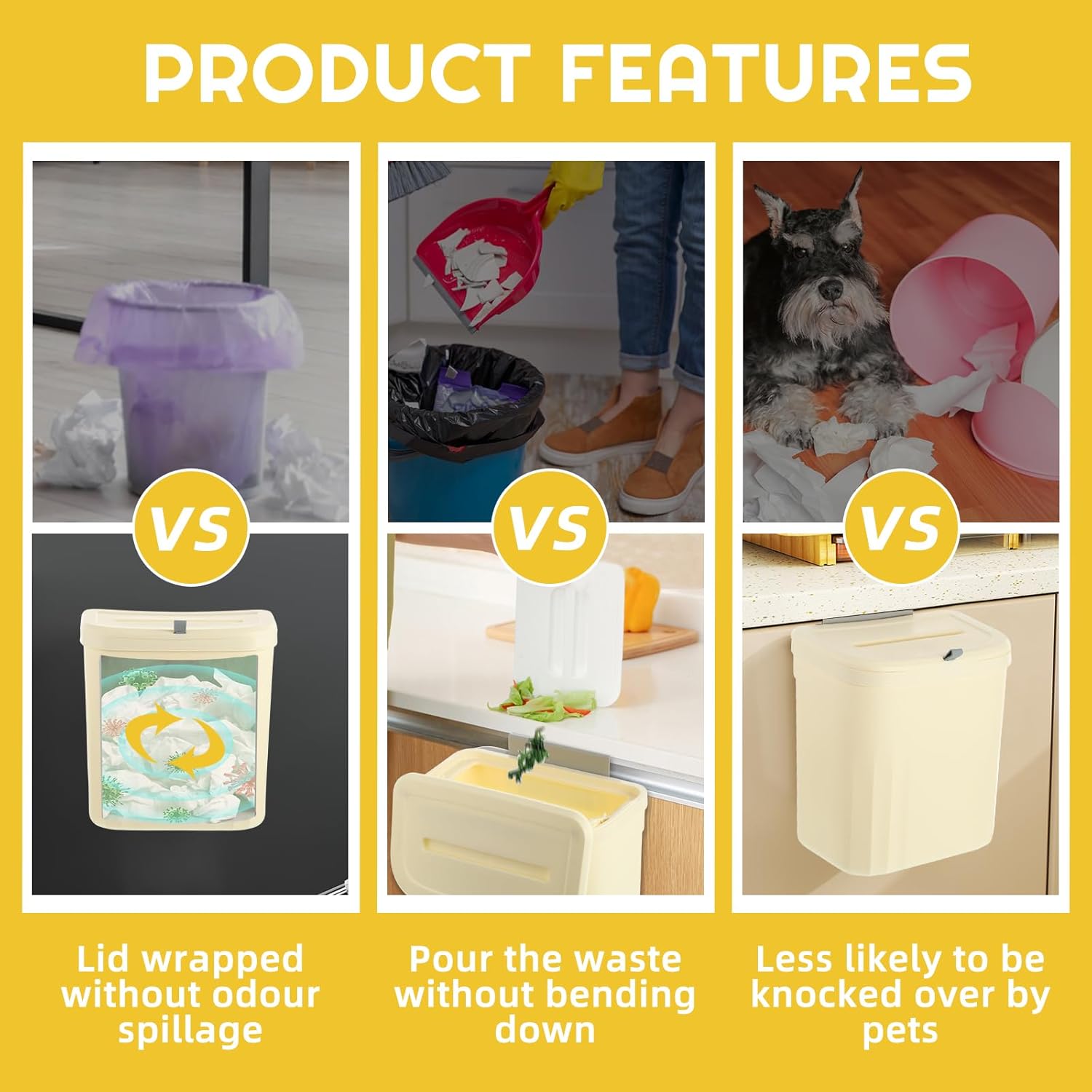 - ✅TWO MOUNTING OPTIONS: Door hooked and wall mounted, comes with hooks and sticky hooks. Can be hung directly on the kitchen cabinet door, easy and simple to use, load the rubbish in as you go. Can be hung on the wall or cabinet door drawer, or stand on the floor when needed.