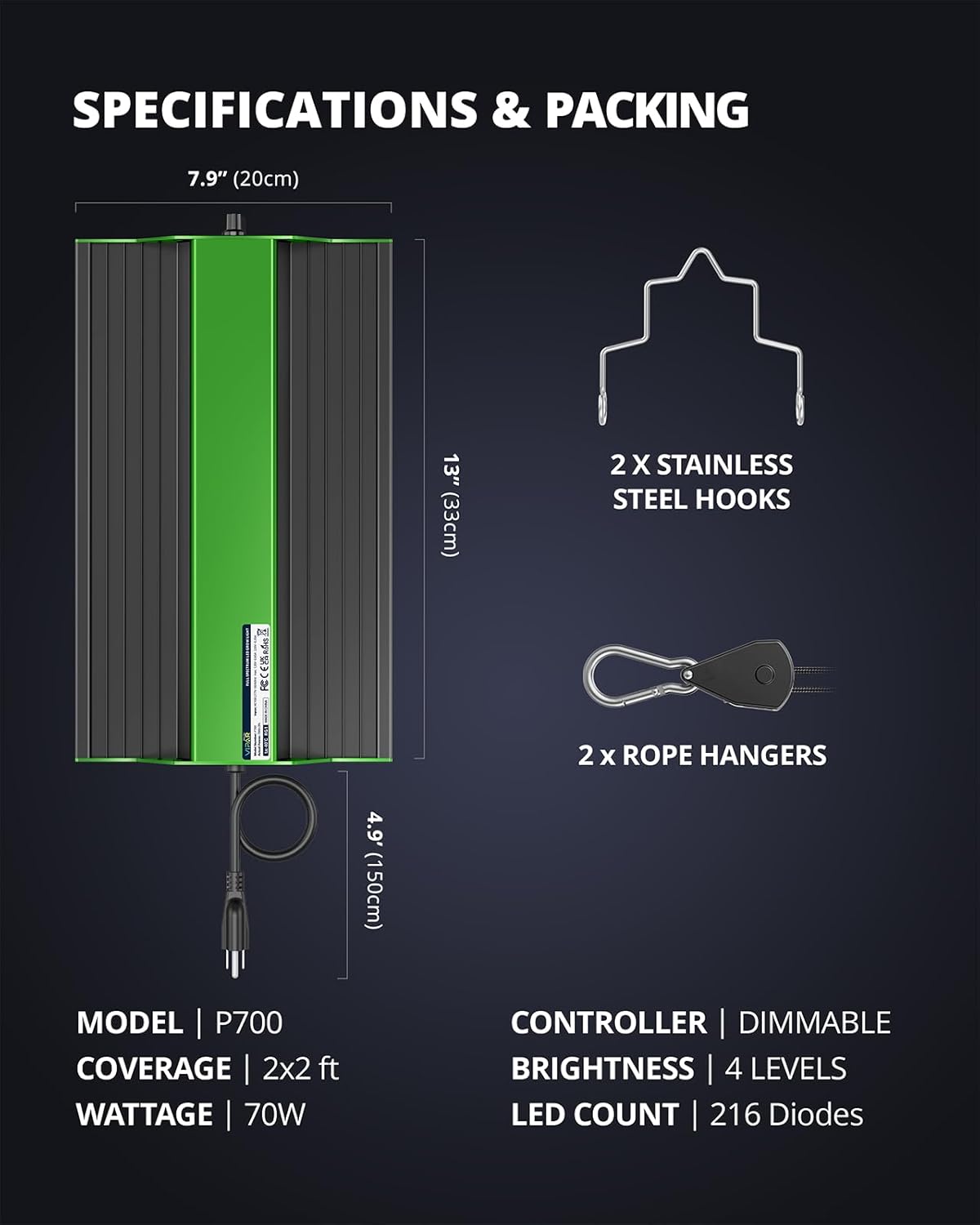 VIPARSPECTRA P700 Grow Light, 70 Watt Dimmable Full Spectrum Plant Light, LED Grow Lights for Indoor Plants Seed Starting Seedlings Vegetable,11000 Lumens Small Hanging Growing Lamp for 2x2 Grow Tent