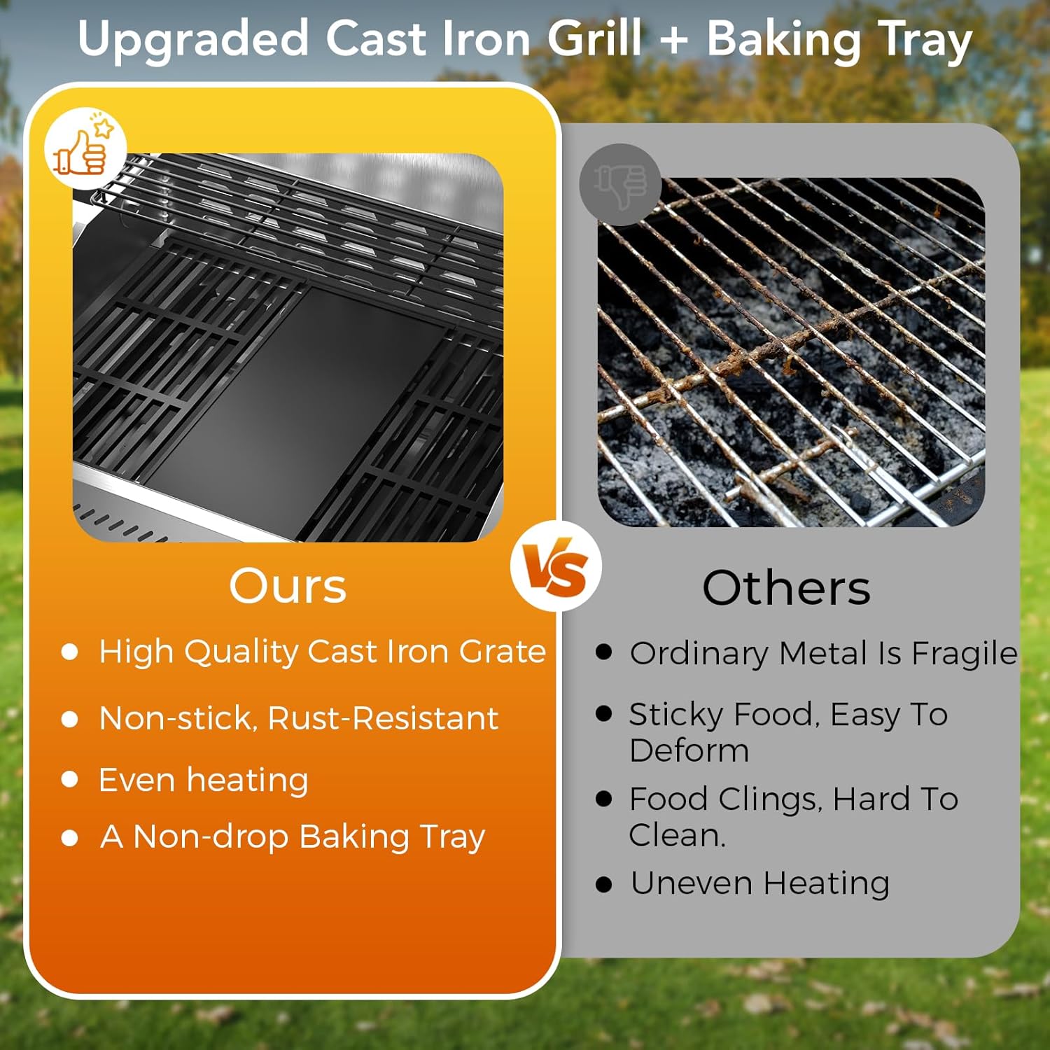 - BBQ Grill with Cast Iron Grate and Baking Tray: The upgraded BBQ grill features a cast iron grate that retains heat for great sear marks and even cooking. the multifunctional baking tray accommodates stir-fries and seafood, while the non-stick finish ensures easy cleanup and durability for many outdoor cooking