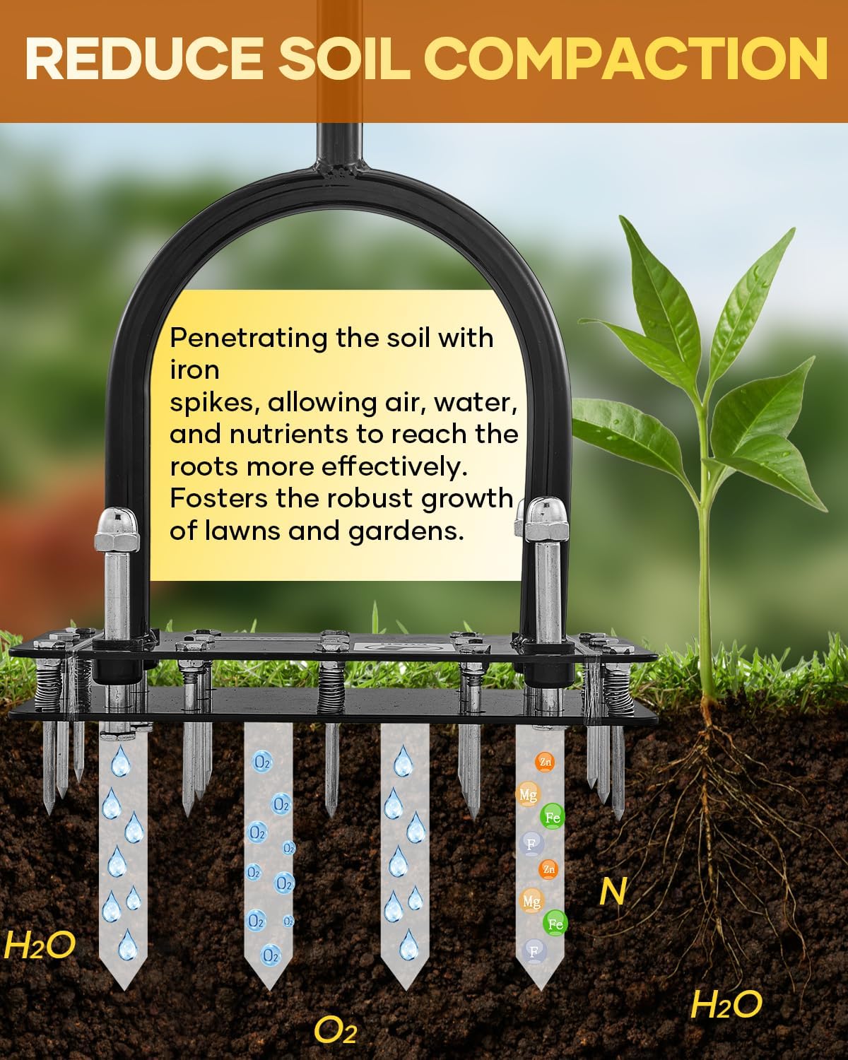 - 【Durable and Sturdy】Garden Tool for Lawn Aeration is made of heavy-duty iron, coated with anti rust powder on the surface, and equipped with a sturdy foot plate that can withstand your entire weight, providing maximum downward force and easily penetrating the soil, ensuring safety and reliability.