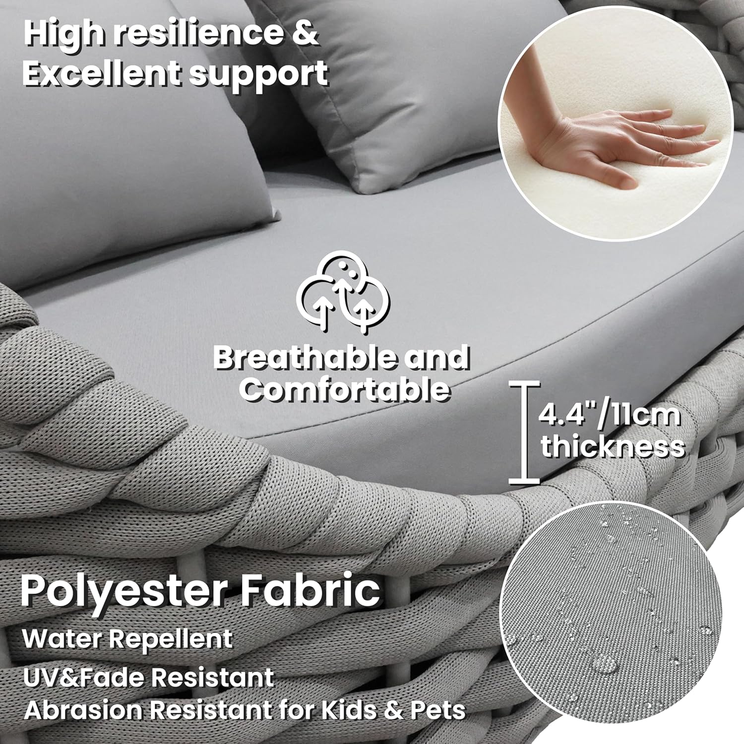 - Filled with 4.3"/11cm thick high-density sponge and cotton, cushions are soft touching and breathable for a refresh comfy patio seating holding its shape in long time using. Water repellent and abrasion resistant polyester fabric also fits families with kids and pets