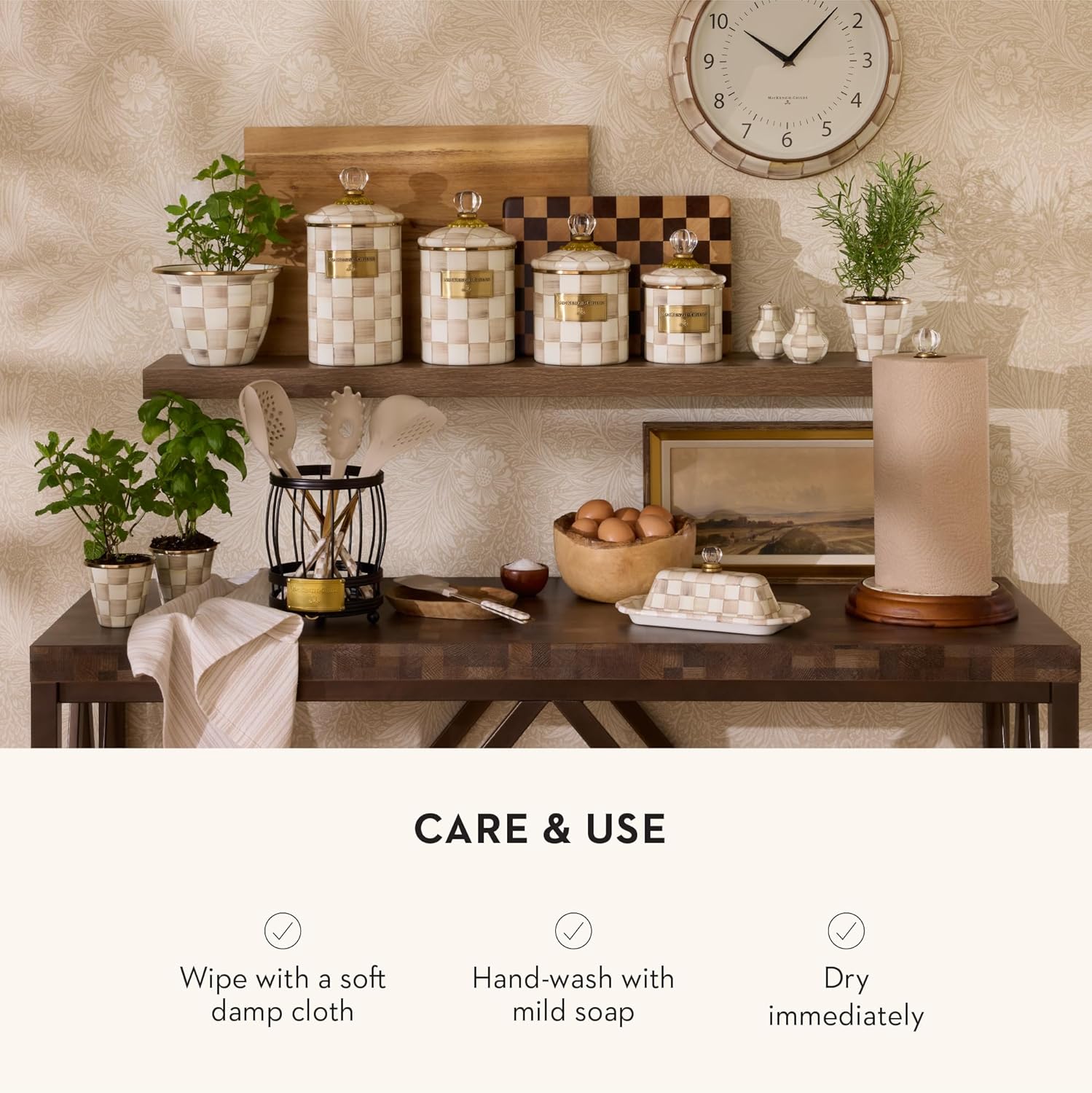 MACKENZIE-CHILDS Enamel Garden Pot, Decorative Pot for Plants, Outdoor Flowerpot Decor, Small, Brown-and-White Mocha Check