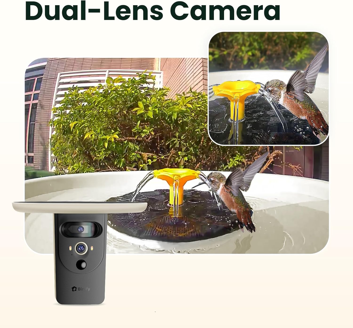 - 【Smart AI Bird Bath with a Dual-Lens Camera】The Birdfy Bath Pro features an integrated smart camera that allows bird lovers to enjoy real-time views and recordings of birds bathing & drinking, capturing lively and engaging moments that bring joy and relaxation. Equipped with a dual-lens camera—a wide-angle lens paired with an automated tracking lens—delivers super sharp 2K videos and photos to your phone.