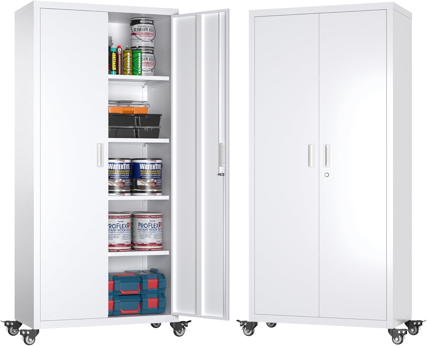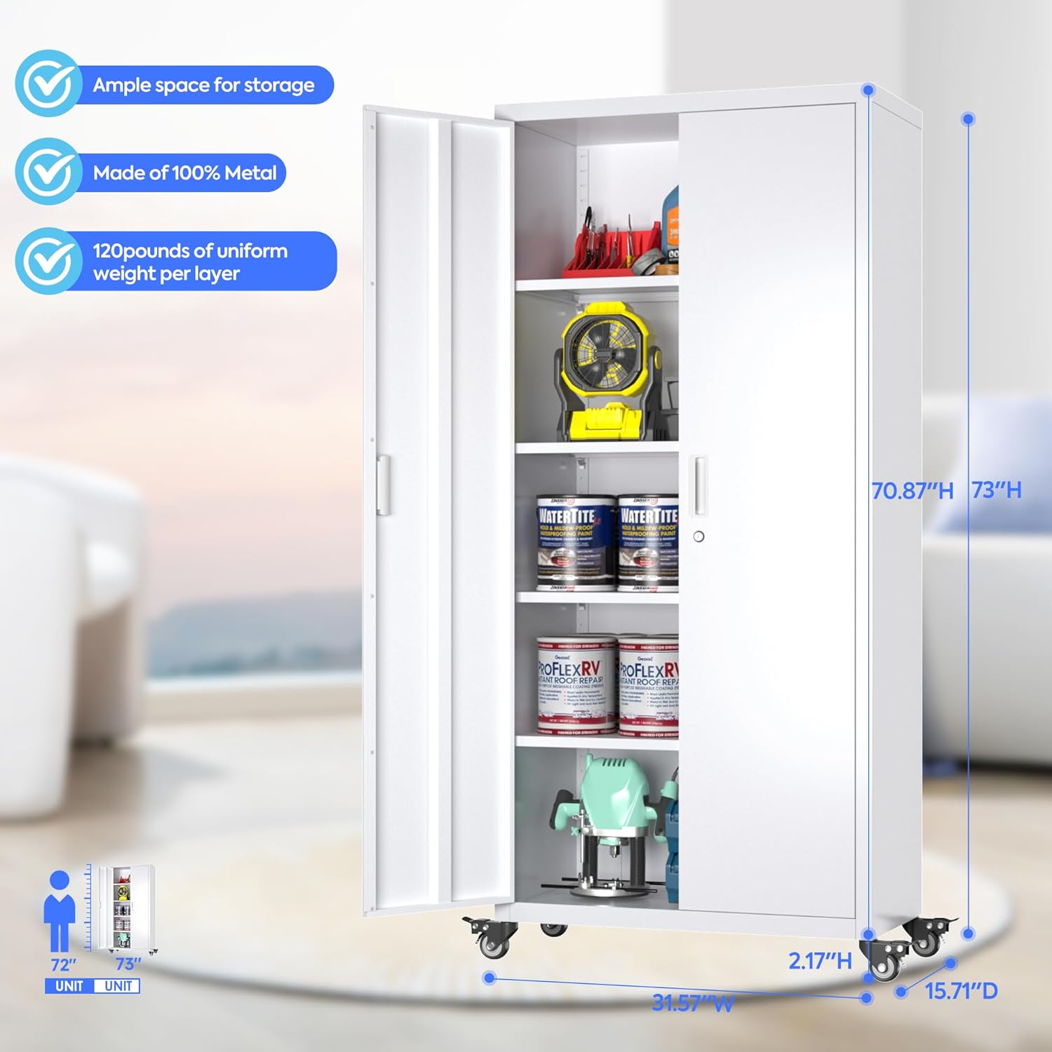 73" H Metal Garage Storage Cabinet with Wheels,Rolling Tool Storage Cabinet with 2 Doors and 4 Adjustable Shelves for Garage,Home,Office,Warehouse,Workshop, Required-Assembly,White