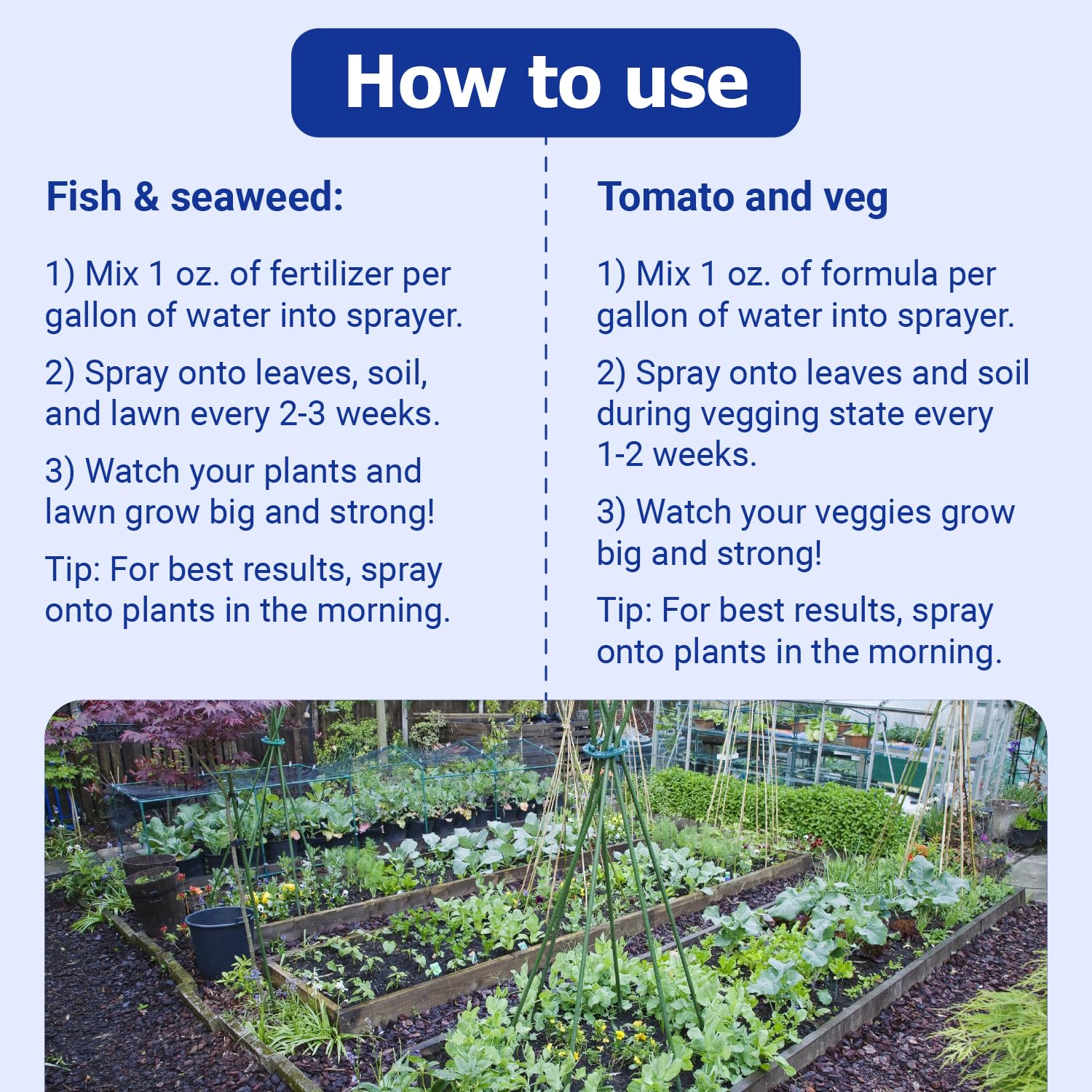 - Organic Fish & Seaweed Fertilizer for Veg & Flowers: This 2-3-1 natural fertilizer is made from organic fish hydrolysate and seaweed; It is designed to nourish plants during active growth stages; this eco-friendly formula promotes stronger roots, lush foliage, and abundant, longer-lasting blooms