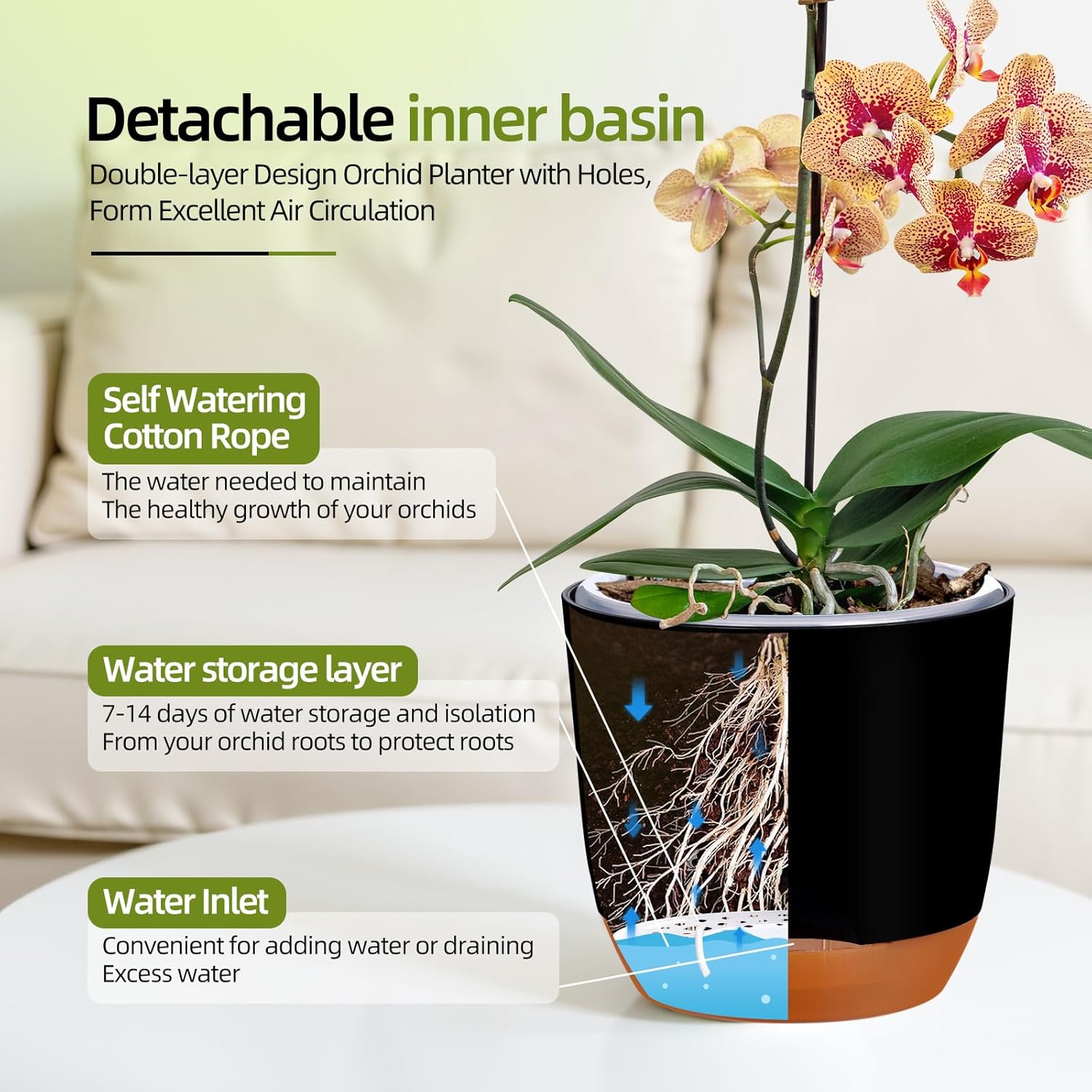 - AT EASE - SELF WATERING: Store a certain amount of water for orchids(7-14 days). The bottom of the inner-pot is always above the water surface to ensure that the roots are not submerged, and excess water will overflow from surrounding holes