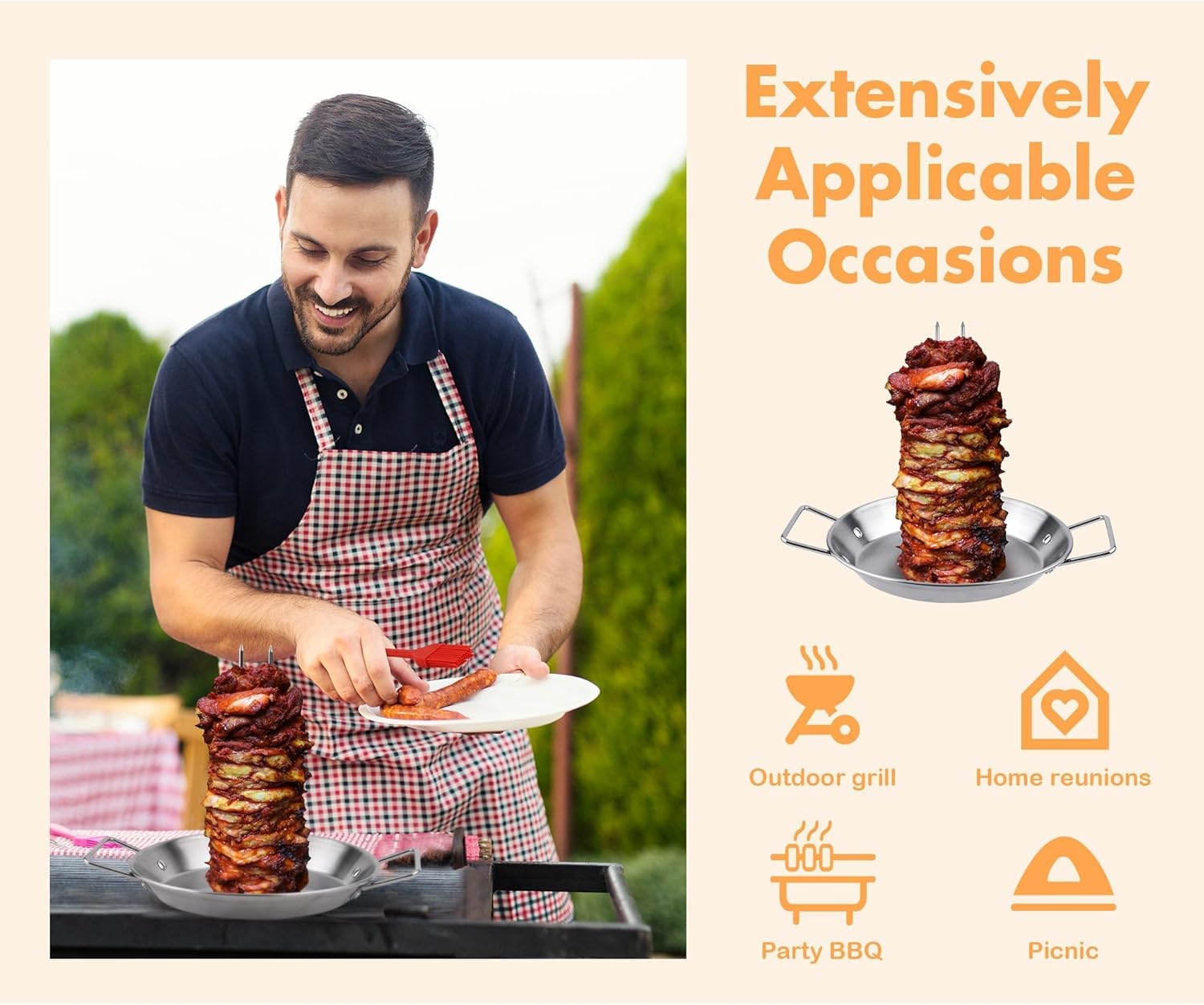 - Package includes: our Al pastor skewer for grill set includes a grill pan with handles measuring 12.8 inches/32.5 cm in diameter, 2 spikes measuring 10.2 inches/26 cm long each, 1 oil brush, 1 pair of tongs, and 1 screwdriver; the quantity and sizes are sufficient for you to apply and replace, and can easily meet your daily use and other requirements