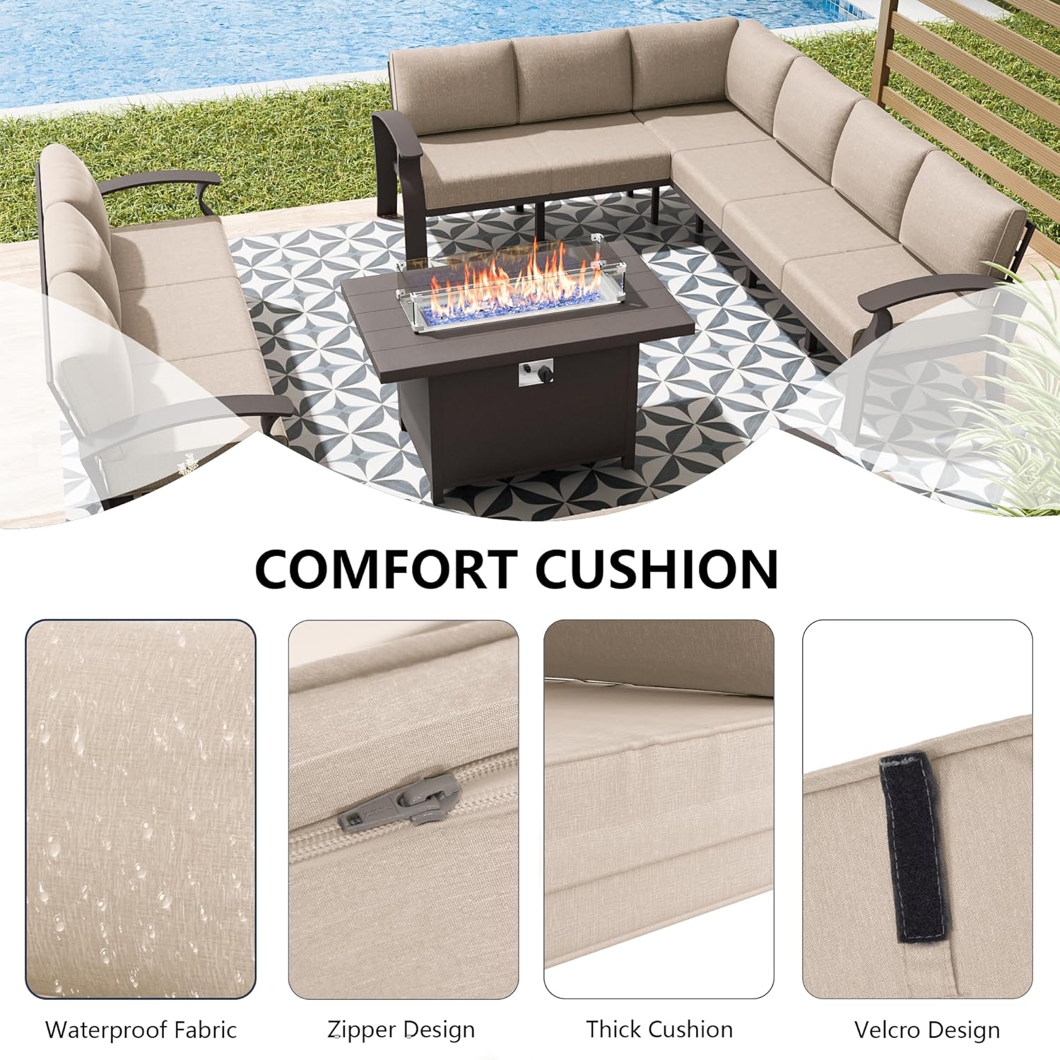 Aluminum Patio Furniture Set with Fire Pit Table, 8 Seats Outdoor Patio Conversation Set Modern Metal Patio Sectional Sofa w/5.1" Upgrade Cushions for Porch, Patio, Backyard(Sand).