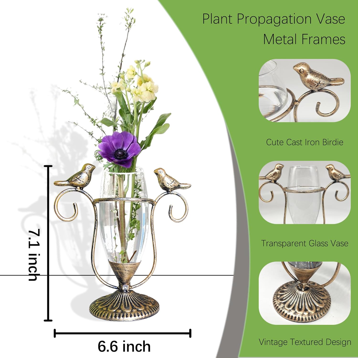 POXOH Vintage Glass Planter - Metal & Glass Propagation Vase with Gold Dual Birds Art, Retro Indoor Planter for Hydroponic Plants, Office Desk Decor, Living Room Centerpiece