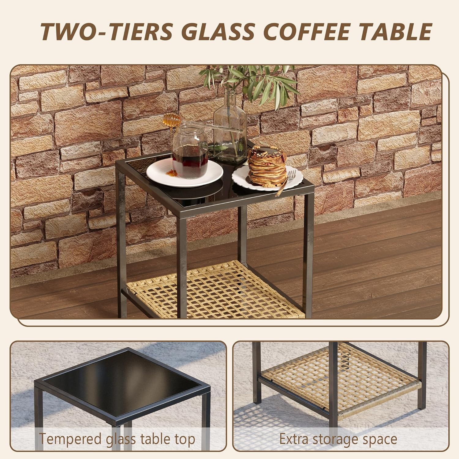 - Convenient 2-Layer Coffee Table: Our 3 piece patio set includes a stylish, multi-functional coffee table with a double-layered design and tempered glass tabletop. The lower shelf adds extra storage space, ideal for organizing items like magazines or decor, complementing your front porch furniture