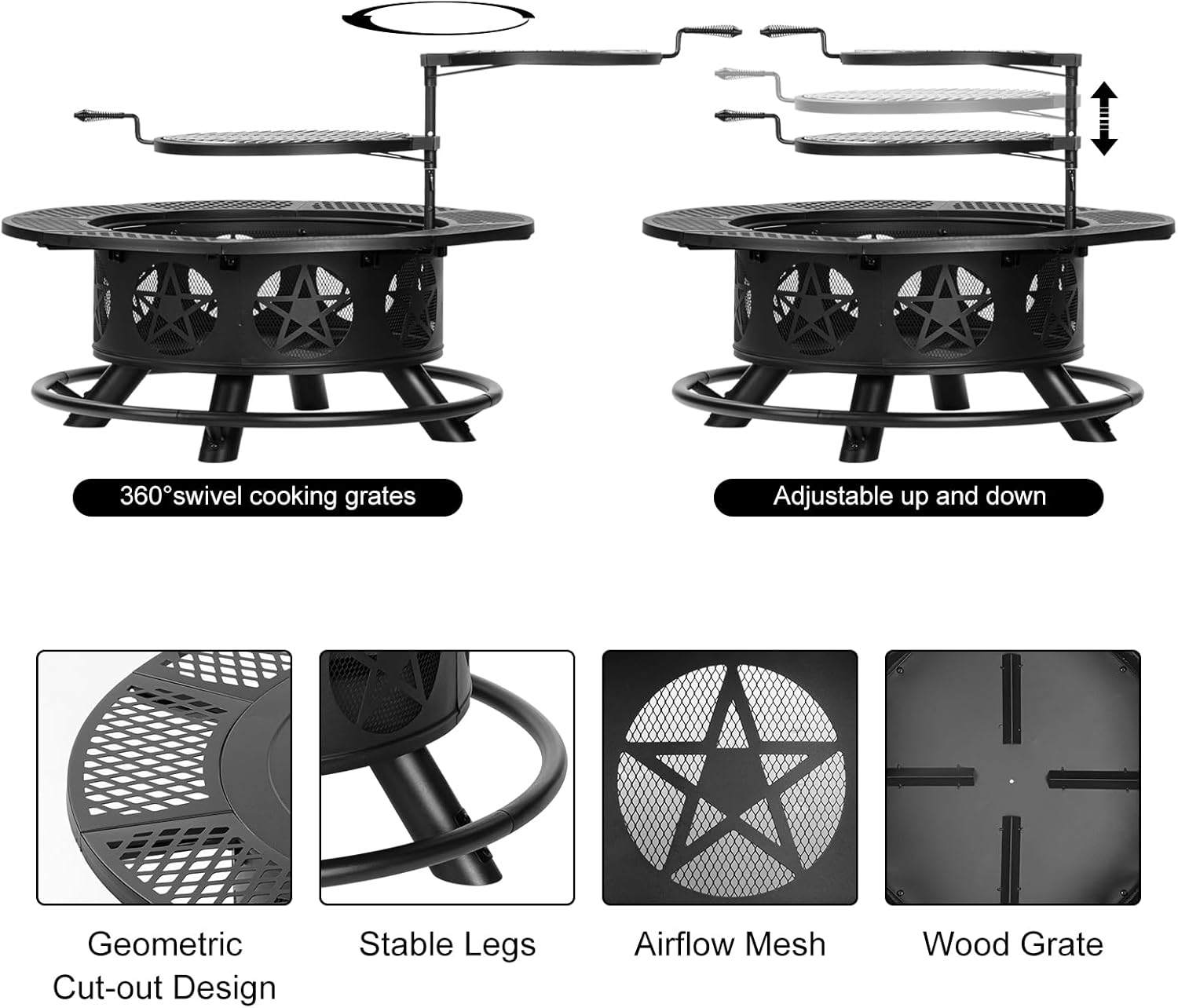 - [Beautiful & Humanized Design]OutVue fire pit table comes with 2 height-adjustable and 360Β° swivel grills which disassemble freely. You can barbecue, keep food warm or put pan to cook on them. The side of wood-burning fire pit is created with classic stars cut-out design which catches firelight for creating fun shadows. The drilled design promotes airflow and keeps the fire strong. All sophisticated designs of the fire pits for outside are dedicated to the warmth and comfort for you.