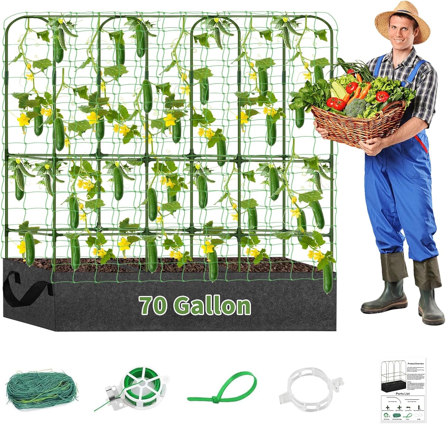 - CUCUMBER TRELLIS WITH GROW BAG: The thickened felt planting bag improves root aeration, boosting survival and fruiting rates. The handles at both ends make transplanting easy, and the 18x52x12-inch large space meets the soil needs throughout the entire growth cycle.