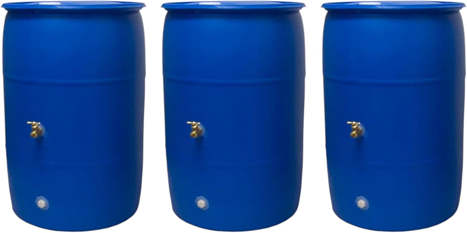 55-Gallon Rain Barrel with Spigot, Blue, Water Collection Container (3 Pack)