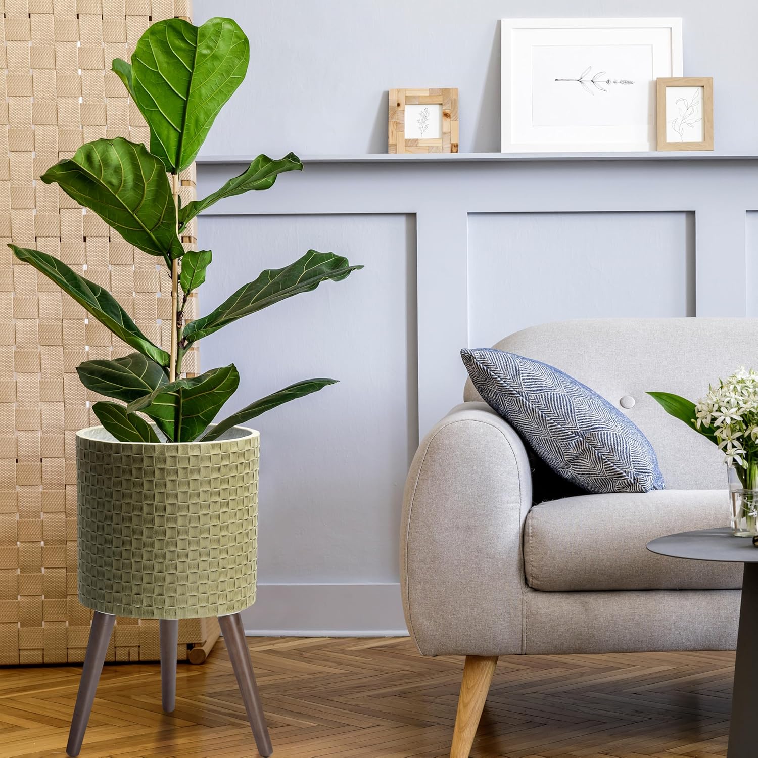 D'vine Dev 12 Inch Modern Geometric Tile Patterned Sleek Planter Pot with Stand, Indoor Outdoor Decorative Plant Holder, Distressed Olive, 88-Z-C-4