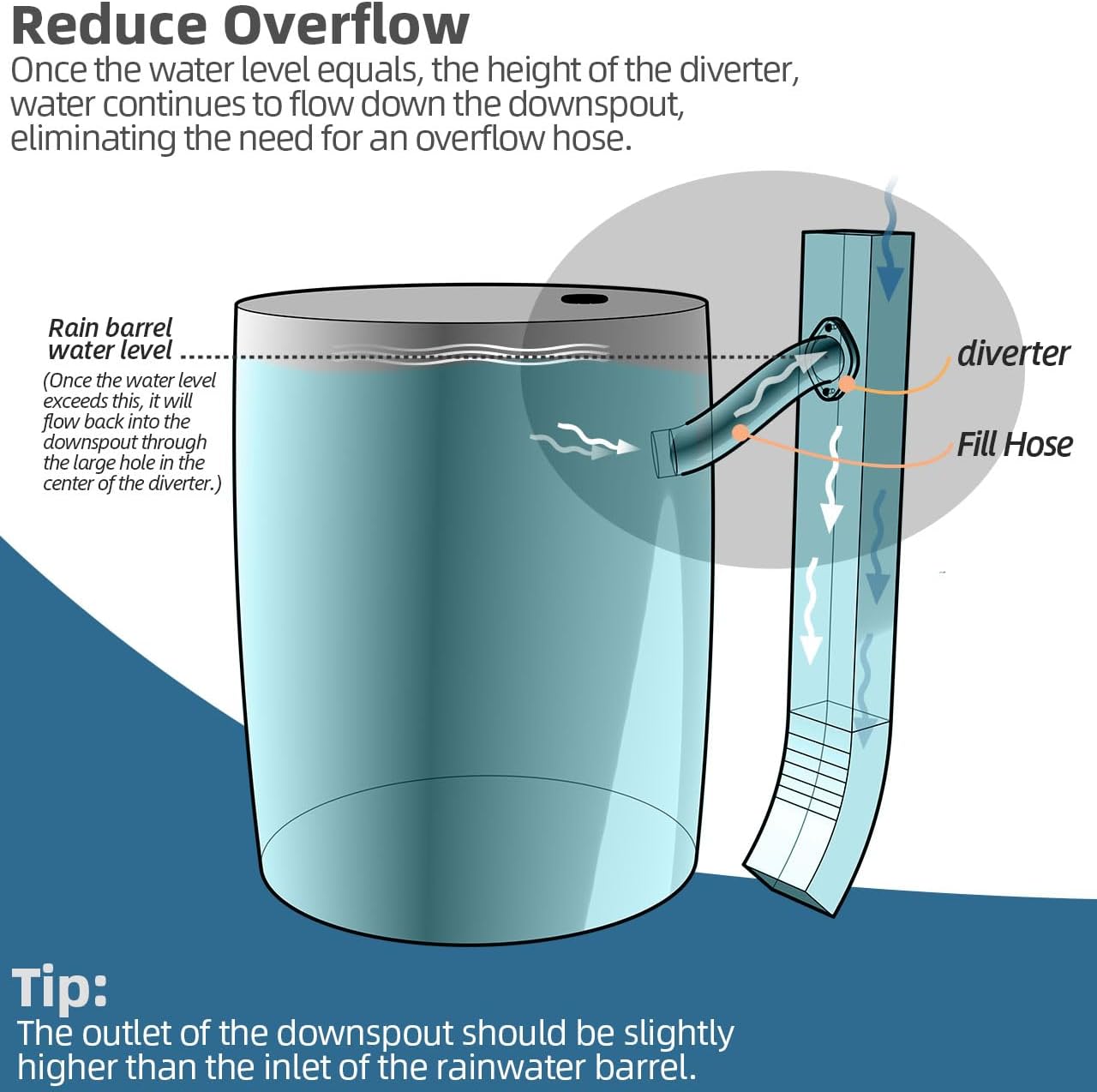 - Reduce Overflow: The downspout diverter regulates the amount of water in the rain barrel to a consistent height. Once the water level equals, the height of the diverter, water continues to flow down the downspout, eliminating the need for an overflow hose.