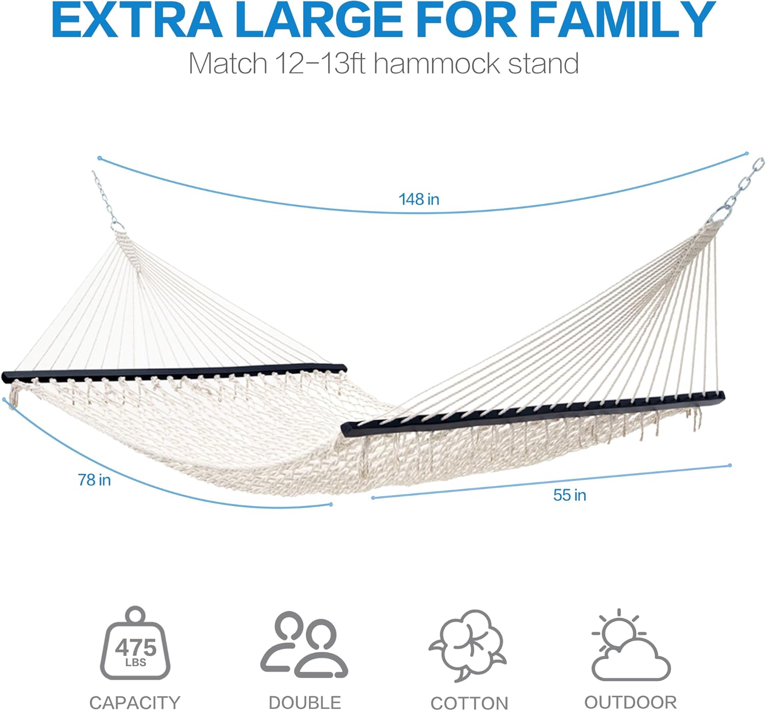 - Spacious Double Capacity:Measuring 13ft long x 55" wide, our extra-large hammock comfortably accommodates two adults while maintaining personal space. Perfect for holiday or family relaxation under summer skies.