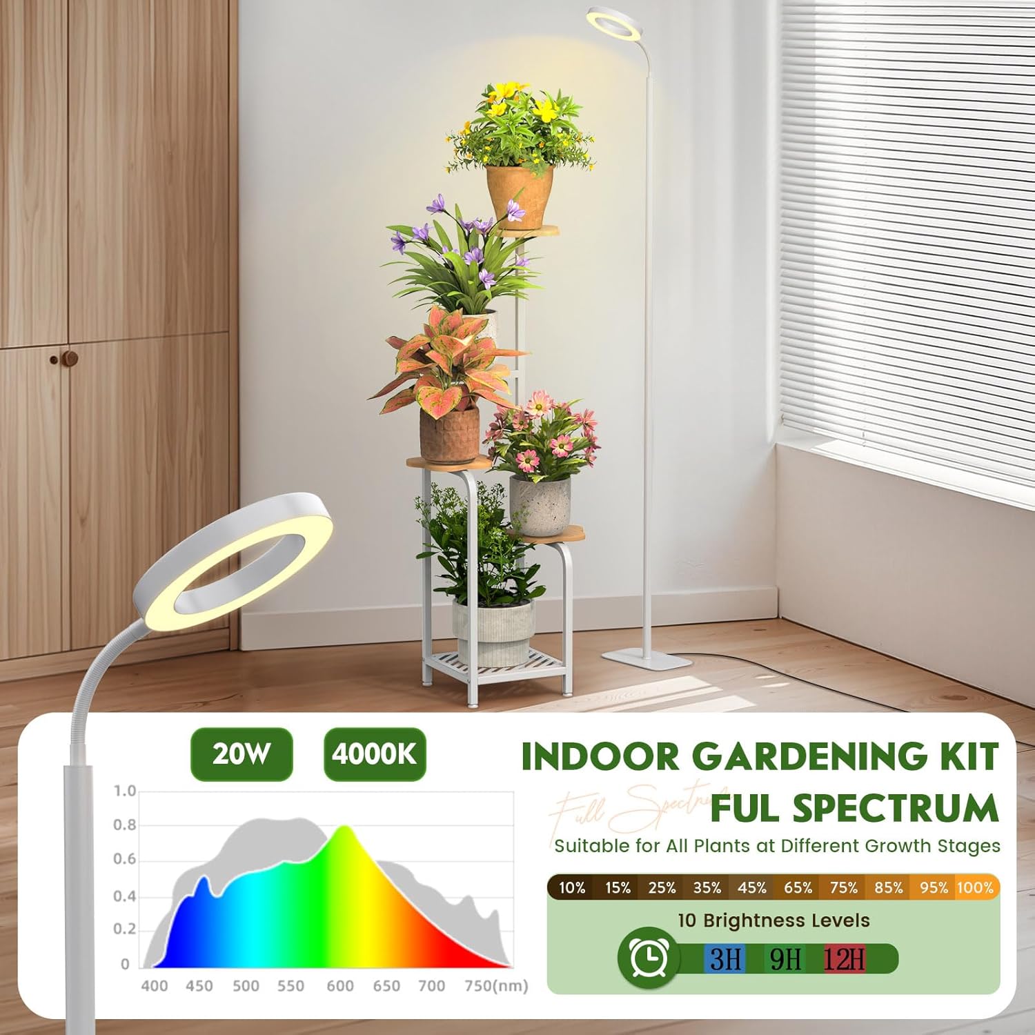 - 【Plant Stand with Grow Lights】Featuring 3 light modes (Red, Red & White, White), 10 dimming levels, and 3 timer settings (3/9/12H). Use it on a tiered plant stand to boost photosynthesis, or detach the lights as standalone desk/bookshelf lamps. The 120° beam angle, 2-head clip-on grow light has flexible goosenecks and rotatable bulbs, nourishing plants while doubling as ambient lighting. Perfect for tall displays in corners or small spaces