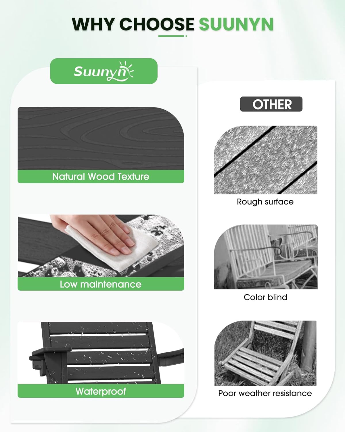 - Weather-Resistant: Made of high-quality HDPE material with wooden texture, SUUNYN sturdy adirondack chair offers excellent weather resistance, resisting fading, splitting, cracking, chipping, peeling, and rotting in harsh conditions. Plus, its easy-to-clean surface and low maintenance