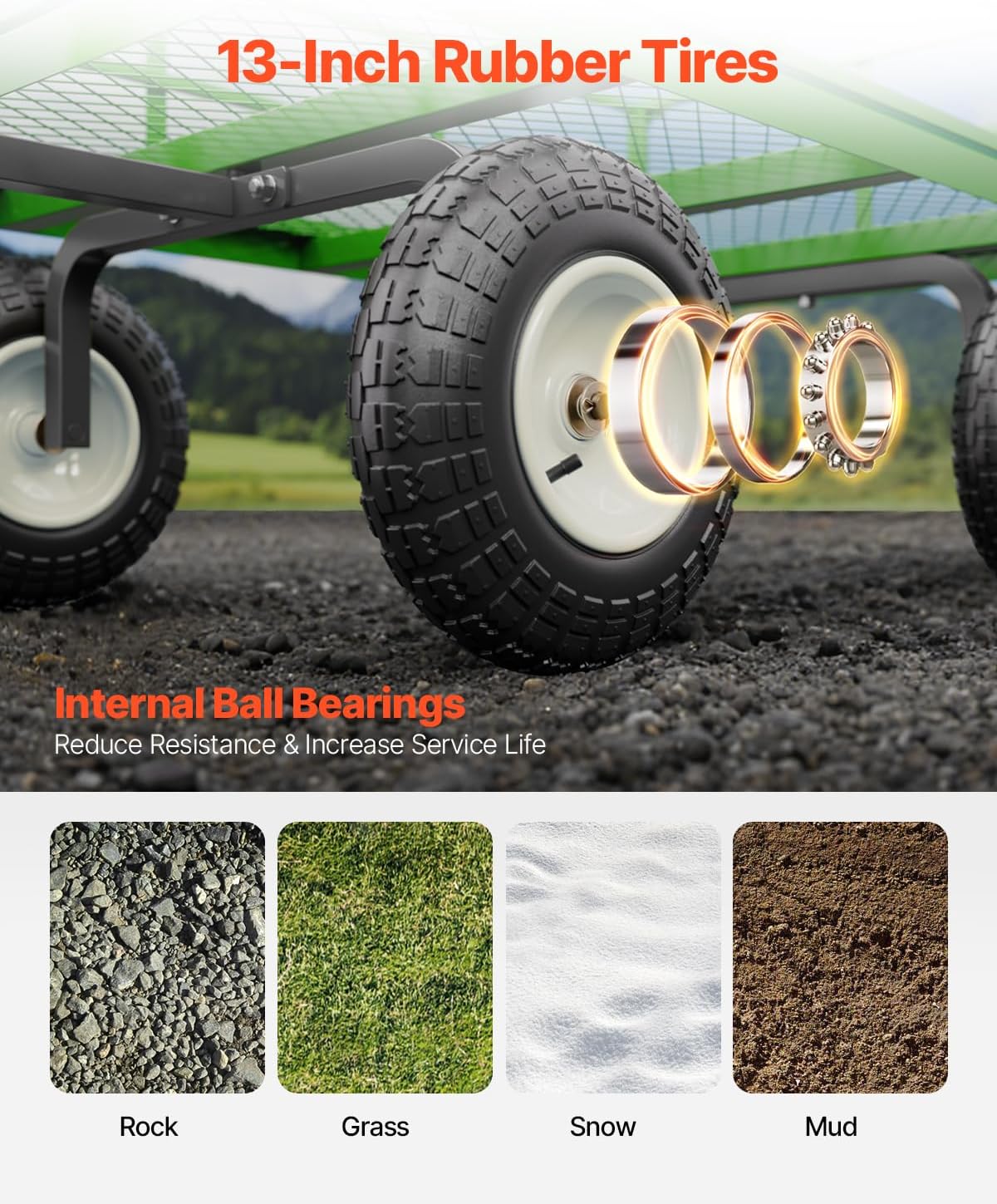 - 360° Rotating Wheels: This yard cart features 13-inch rubber tires with sturdy metal hubs that provide smooth mobility on grass, mud, rocks, and snow. Its robust design ensures stability across various terrains, making your outdoor transport tasks effortless.