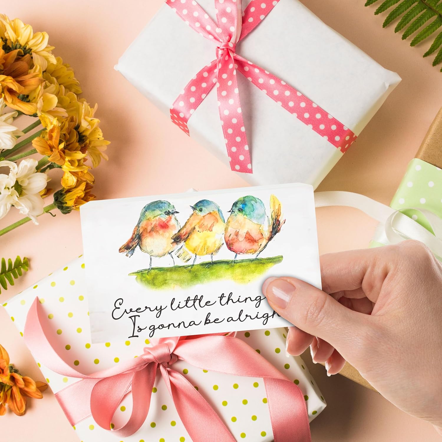 Rustic Pine Wood Block Sign - Every Little Thing Is Gonna Be Alright - Watercolor Birds, Positive Wooden Plaque For Desk Top, Shelf, Gift For Friends, Home & Office Decorations(4 X 6 Inches) - D10