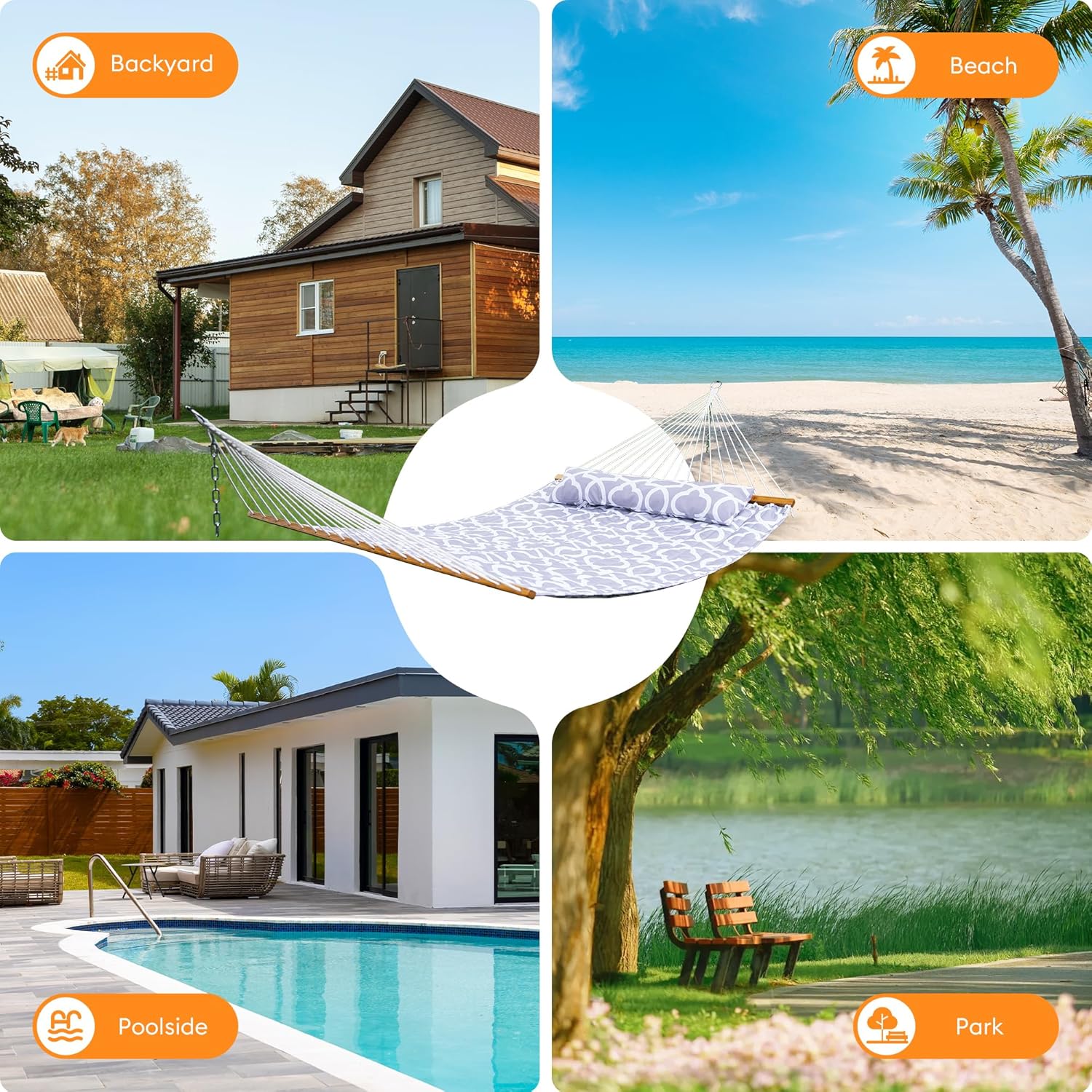 Double Hammock with Spreader Bar,Soft Pillow,Max Load 500lbs,Portable Hammock for Outdoor,Camping,and Backyard,White Gray