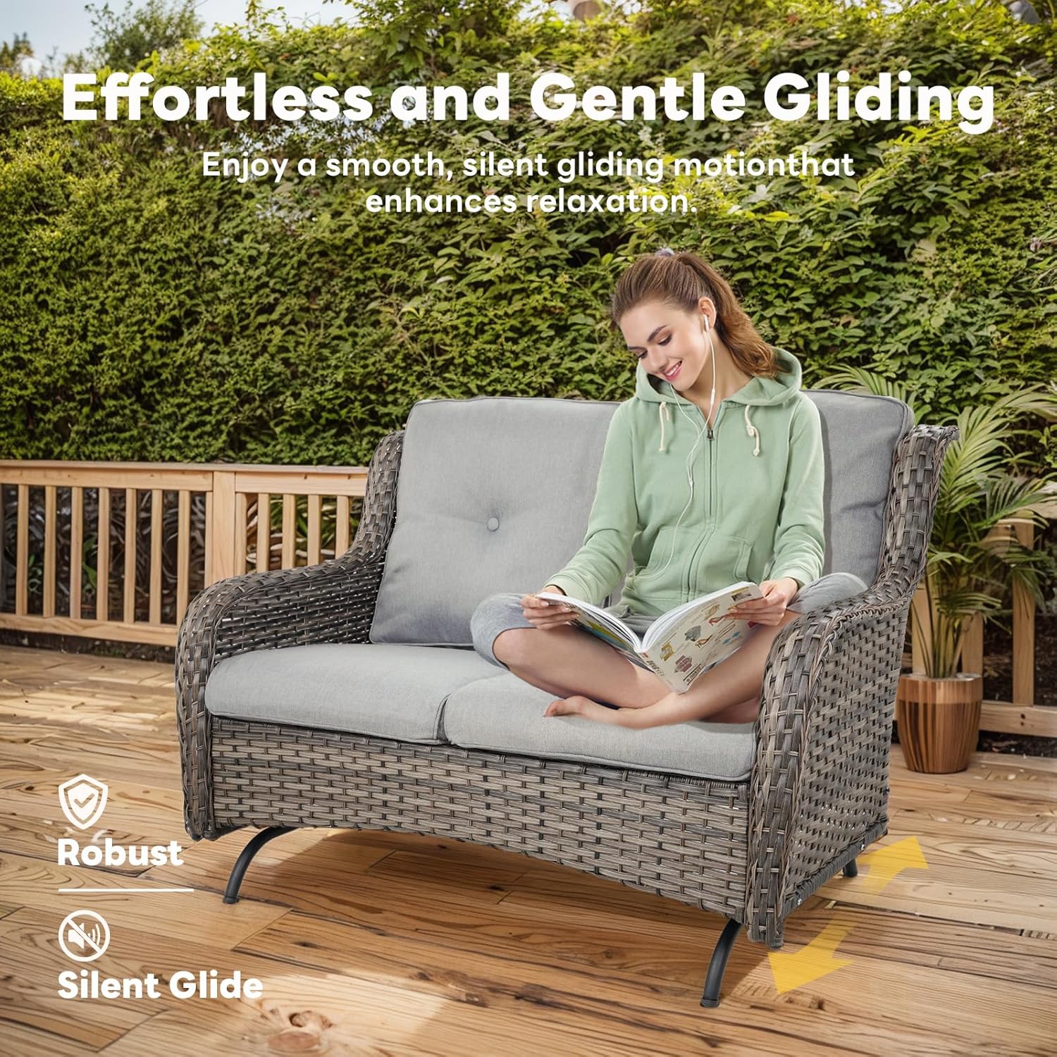 5 Piece Outdoor Patio Furniture Set - Outdoor Conversation Couch and Loveseat Glider Chair Furniture Set with Rattan Coffee Table for Deck Balcony Poolside Gray Wicker/Grey Cushions