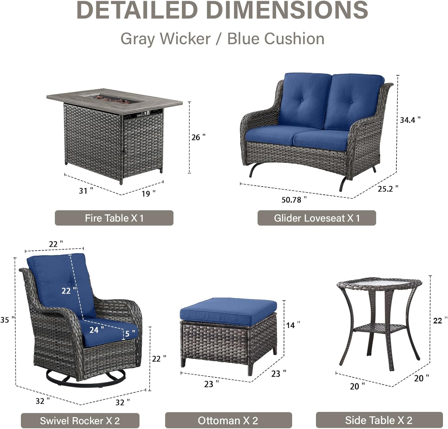 - 8-Piece Outdoor Patio Conversation Set: This thoughtfully designed outdoor furniture set includes a wicker loveseat glider chair, two swivel rocker chairs, two ottomans, two side tables, and a 41-inch 50,000 BTU propane fire pit table. Perfect for creating a comfortable and stylish patio conversation area in your backyard, porch, or deck.