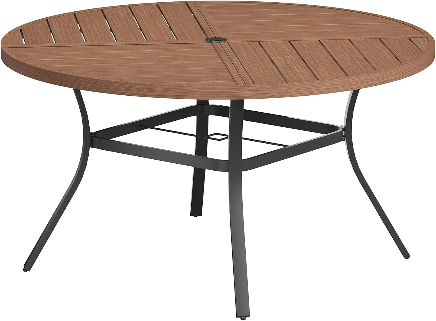 VICLLAX Round Patio Table with Adjustable Umbrella Hole for 8, All Weather Metal Outdoor Dining Table for Lawn Garden, 53.1" Outdoor Coffee Table, Walnut Wood-Like Tabletop