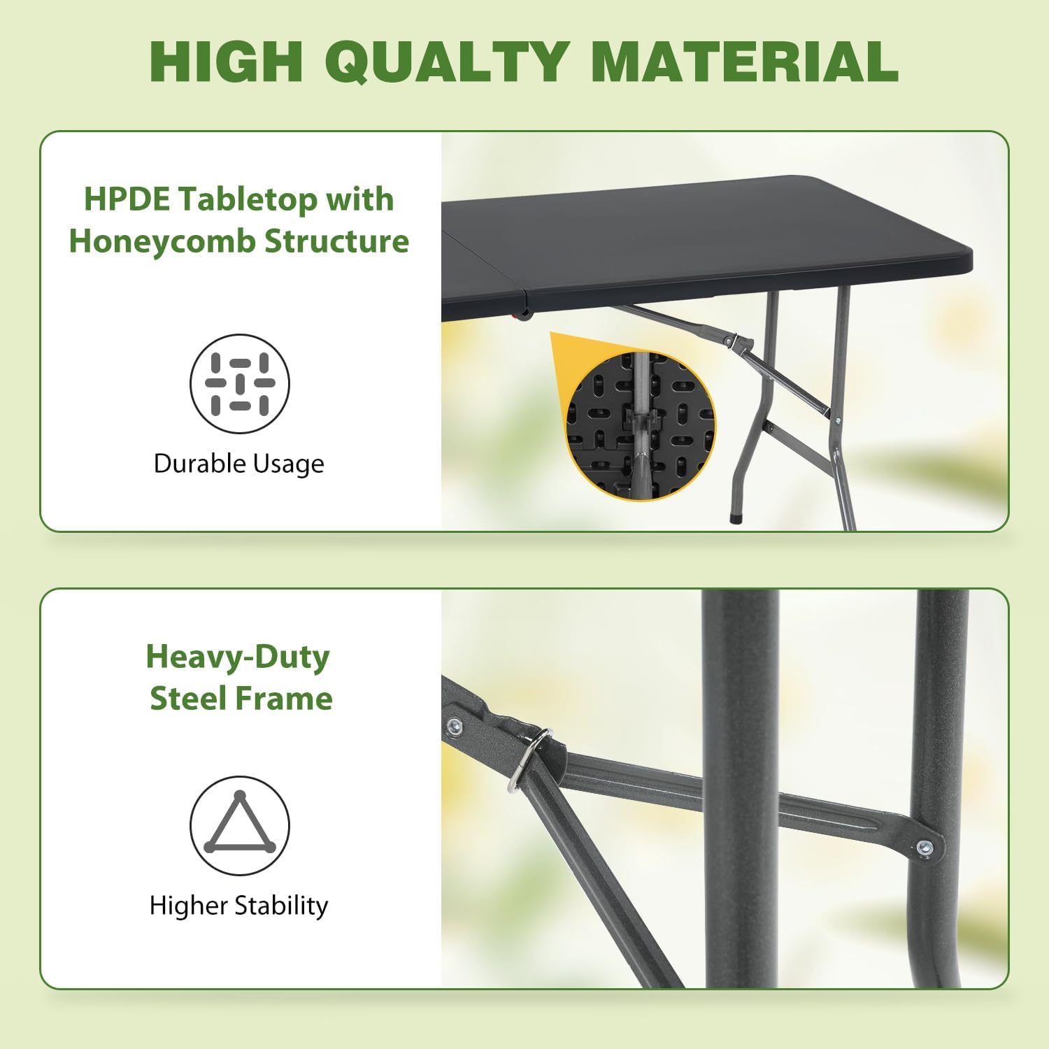 - 【Foldable】This 6ft picnic folding table can be folded in the middle and fastened with a safety catch for easy storage. You can put the folding table away in the trunk of your car, or in a small corner, and easily pick it up when you need it. camping tables that fold up lightweight.