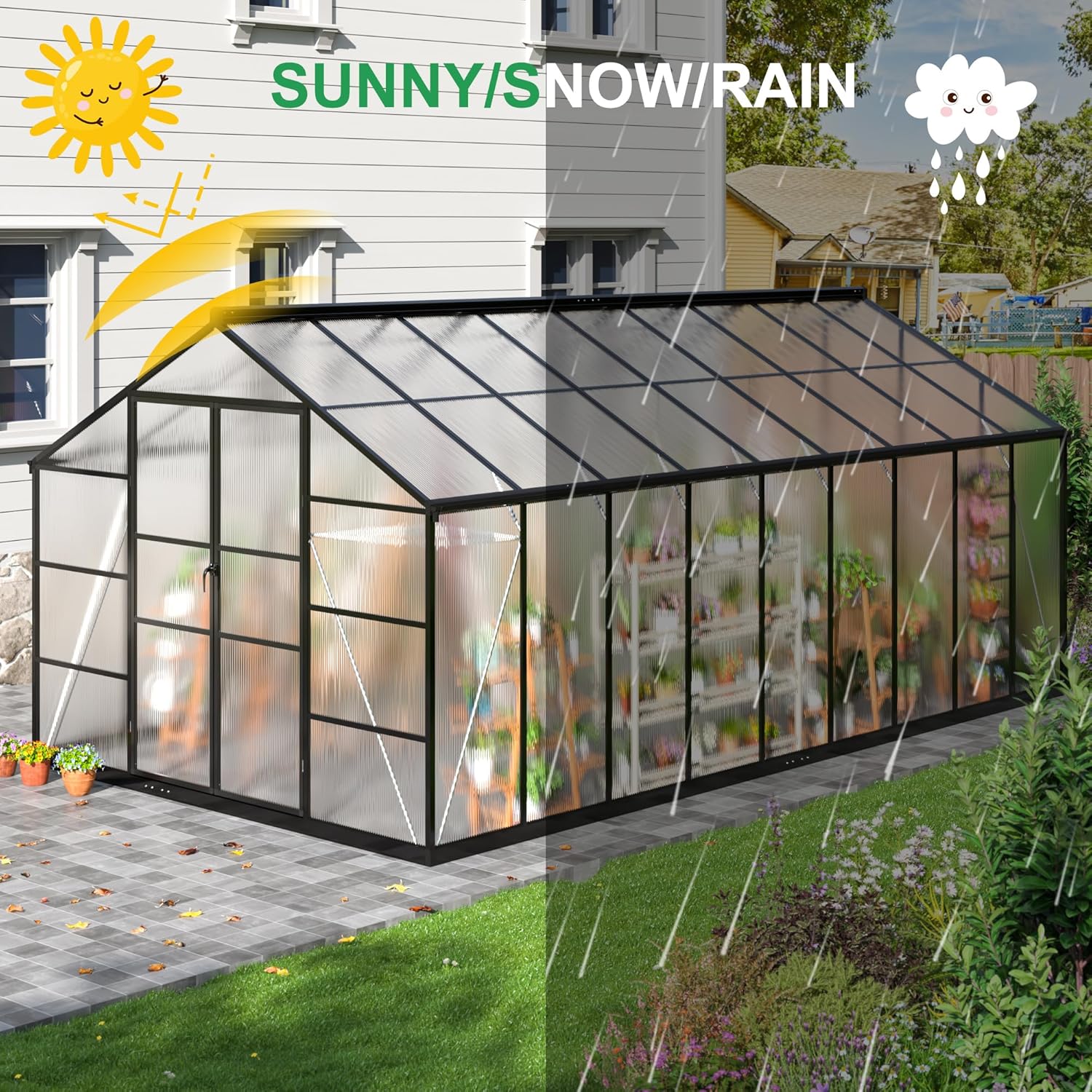 - 【High Performance】The greenhouse panels are coated with an anti-UV layer that blocks harmful rays while allowing beneficial sunlight in. Made of high-quality polycarbonate and reinforced aluminum frames, they offer robust protection against wind, rain, and snow. This sturdy structure ensures your plants have a stable, year-round growing environment, withstanding even severe storms.