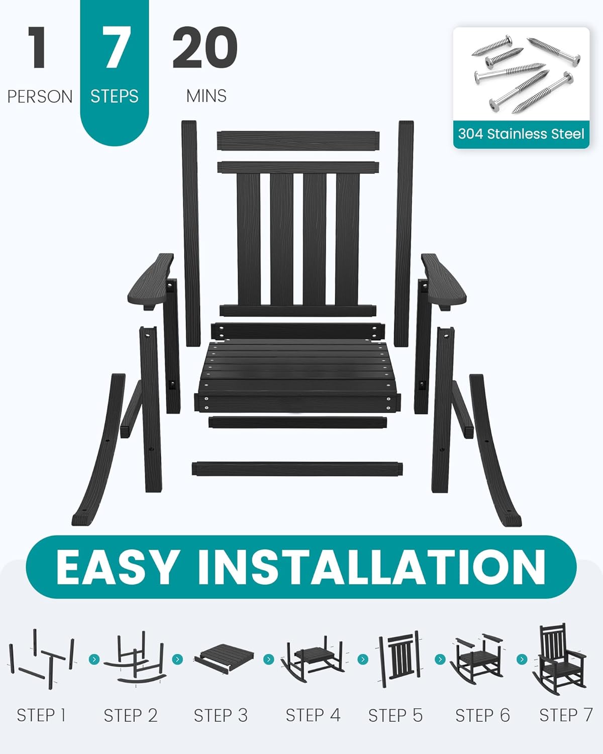 - 30-Mins Installation: Your SERWALL porch rocking chair requires just 30 minutes to assemble with included hardware and instructions. An online video guide is available for this patio rocking chair.(Note: For best results with your outdoor rocking chair, fully tighten screws only after complete assembly.)