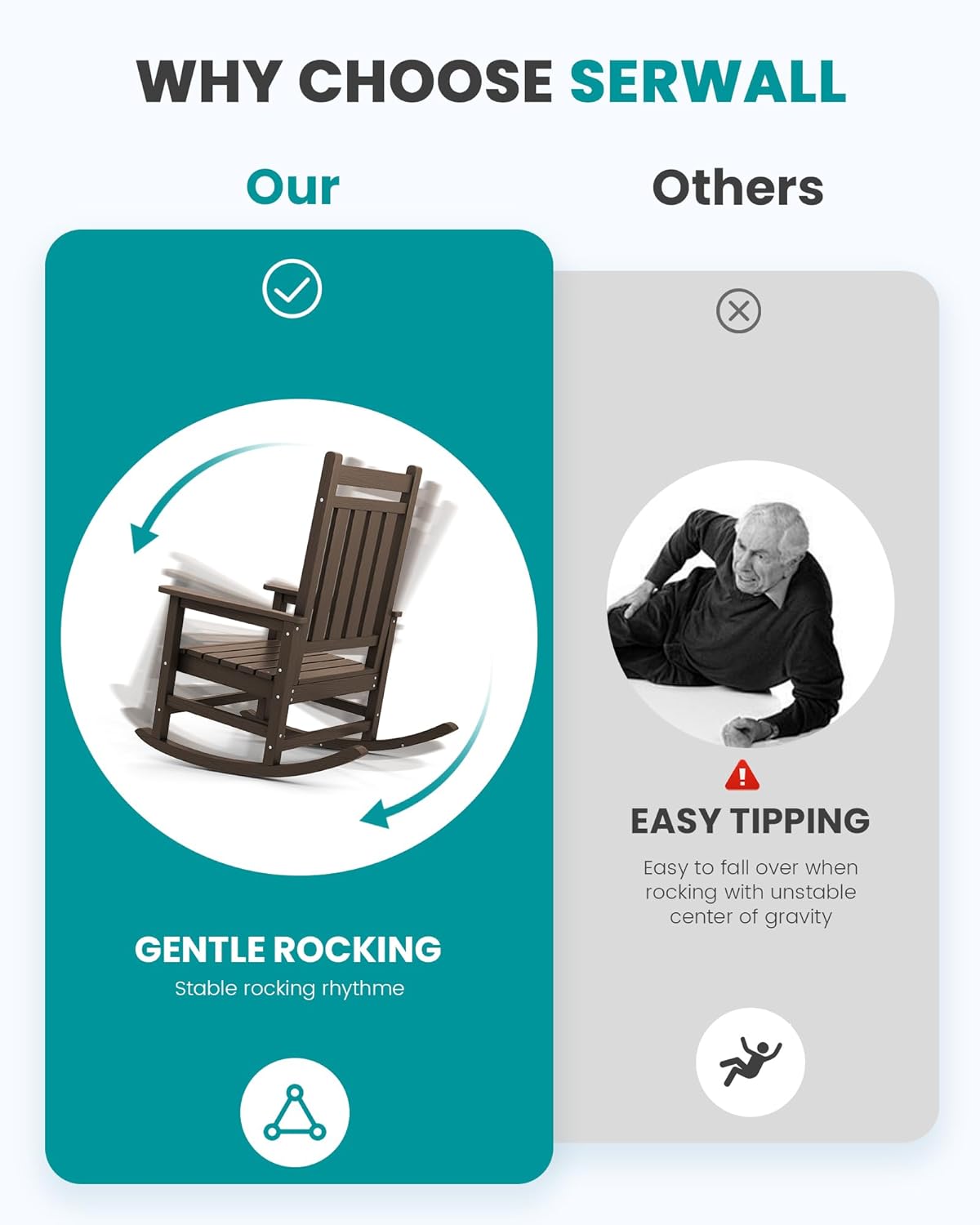 - Details Make It Successful: This porch rocker features an ergonomic curved backrest—unlike traditional straight-back designs—providing superior reclining comfort. With wide armrests and a contoured seat, the SERWALL rocking chair alleviates fatigue. (Tip: Pair it with our cushion [ASIN:B0D7Q1V8ZC] for added comfort.)