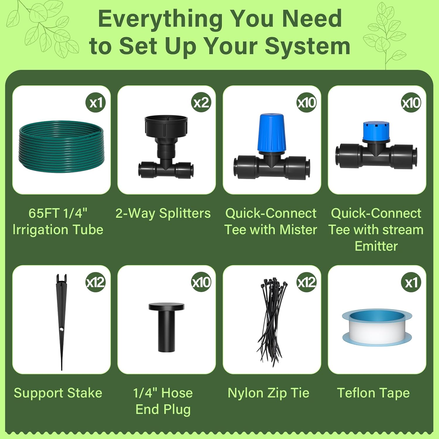 - π§ All-in-one drip irrigation kit β Includes 65FT tubing, 10 stream drippers, 10 misting nozzles, quick-connect fittings, and everything you need for a fully functional garden drip irrigation system. Ideal for anyone looking to build or upgrade their irrigation system.