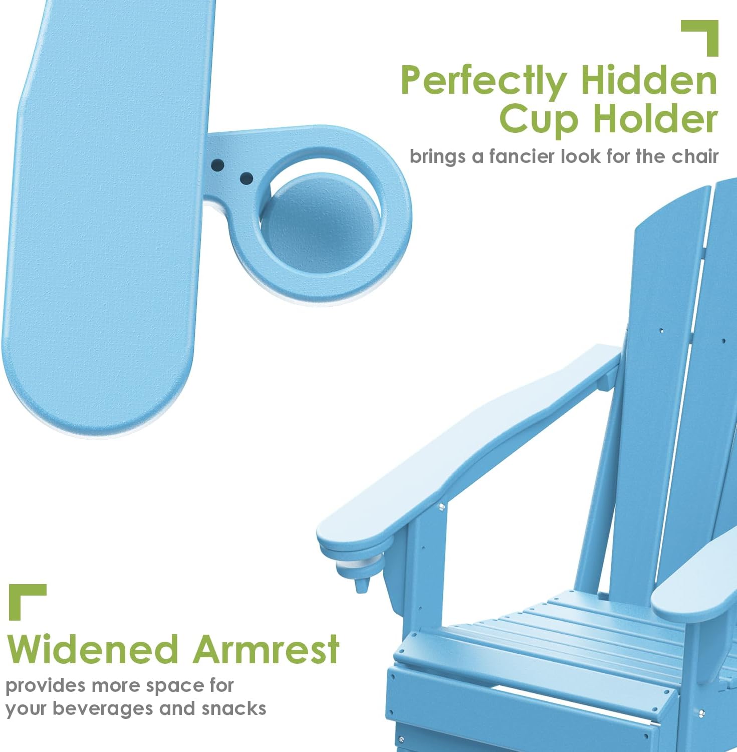 - 【Ergonomic & Foldable】 GreenVines Folding Adirondack chair features a hidden cup holder in the right arm, offering ample space for drinks or media devices. The reclined legs are designed for stability without the need for pins or chains. Easily foldable, this chair is perfect for storage at home or for taking on road trips. The slatted seating ensures quick drying after rain, while trimmed edges enhance safety for you and your family