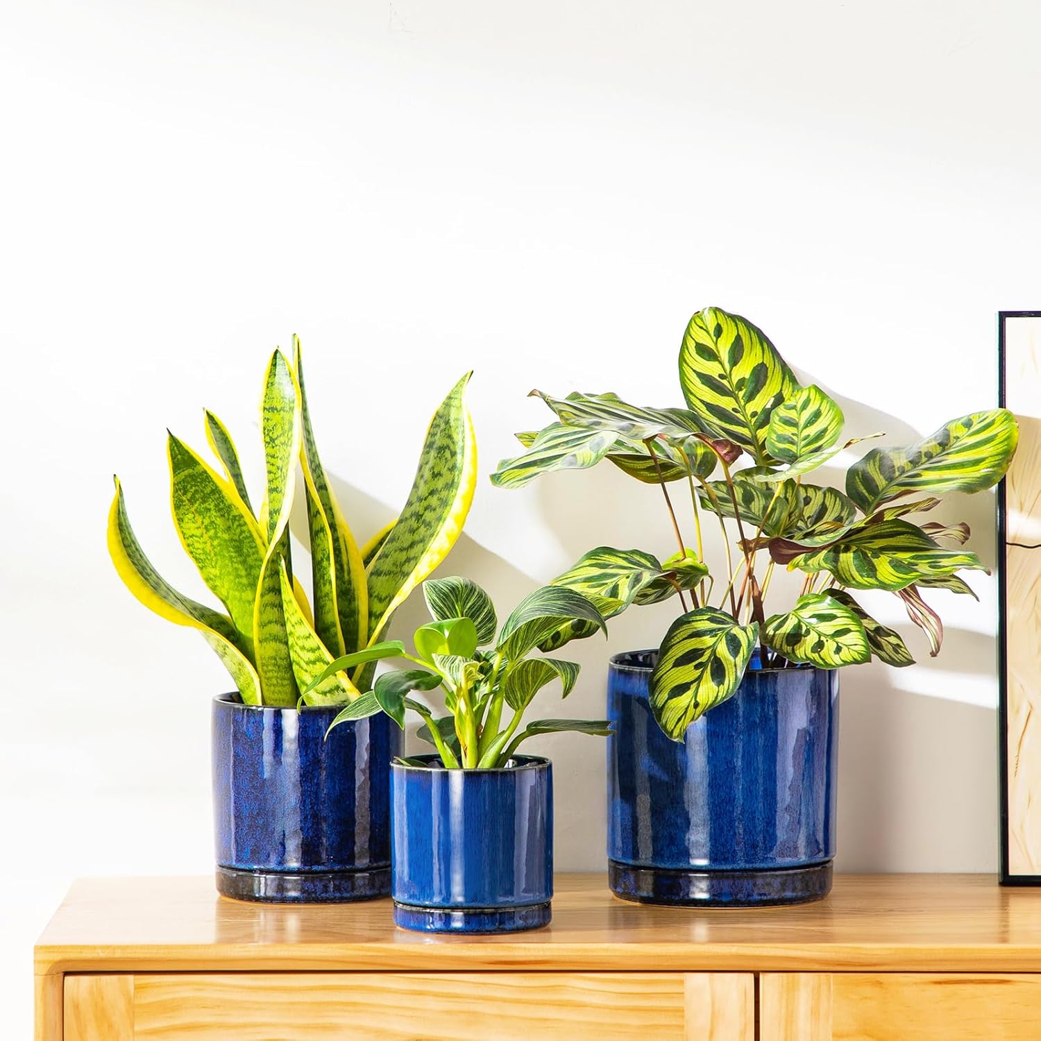 vancasso Ceramic Plant Pots, 3 Piece Planters for Indoor Plants, 4.25+5.25+6.25 Inch Flower Pots with Drainage, Plant Pots Indoor for Succulent, Pothos, Snake Plant and Money Tree, Etc (Blue)