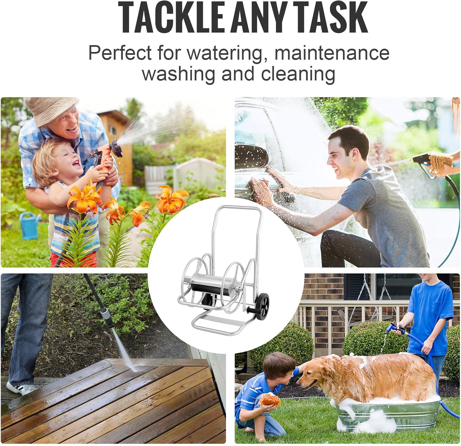 - Large Hose Capacity: Are you tired of coming up short? The hose reel cart can hold up to 200 ft of 5/8 in hose (hose not included), allowing you to reach various corners of your garden, backyard, or other areas without any limitations